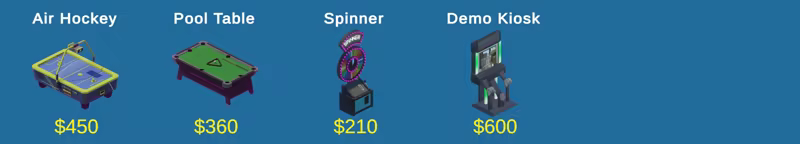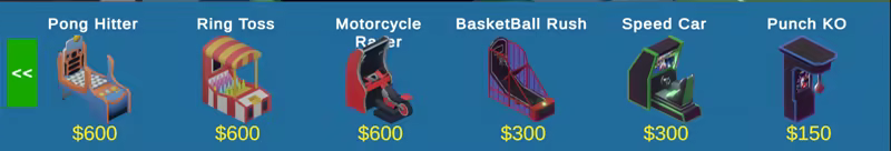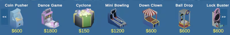 Crane Games, Coin Pushers, Bowling, Air Hockey, Dance Games, Hit Target Throwing Games, Pinball, Motorcycle Racing Game, Unlock the lock game, Lightgun game, Arcade Cabinet, Japanese styled arcade cabinet, Ball Drop Arcade Game, Coin Pusher, Ring Toss, Pong Game, Vortex Game, Bowling Game, Big Wheel Spin, Ticket Checker, Lots of furniture object...and more on release!