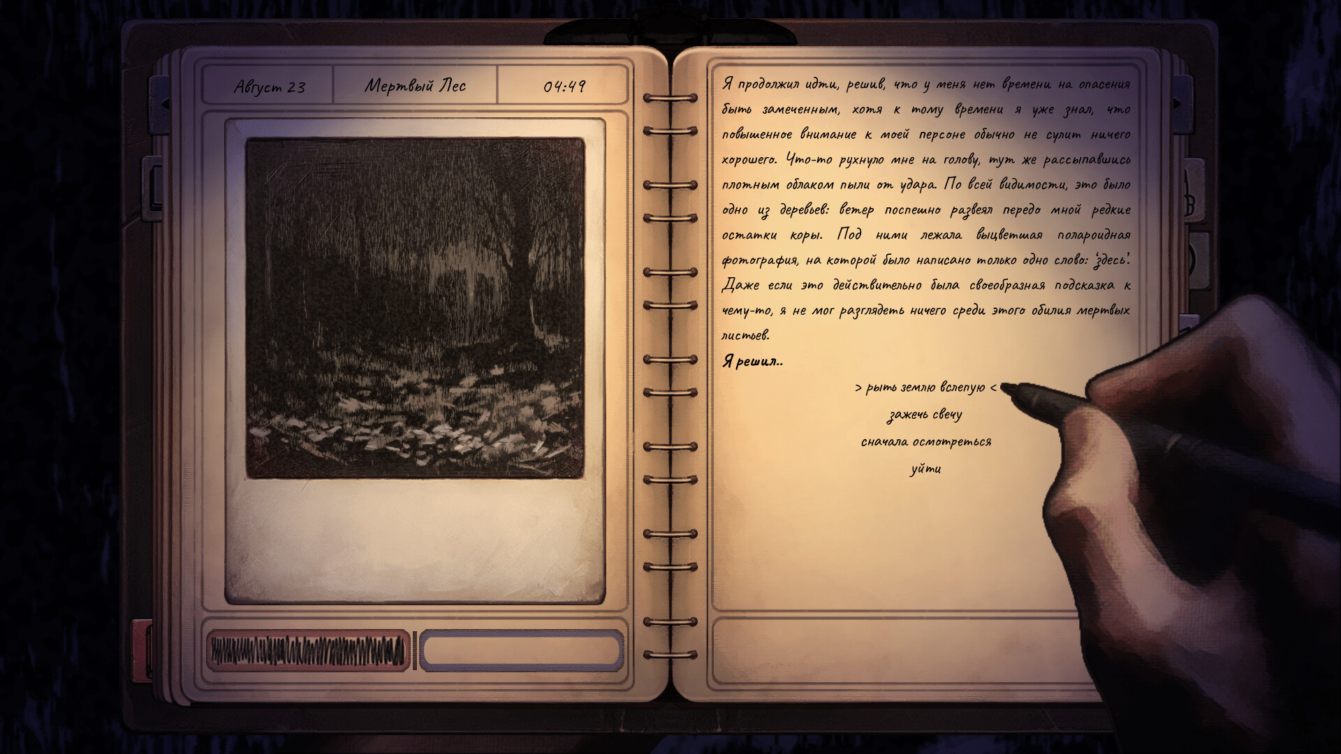 Ваша машина ломается посреди безлюдной дороги. Вы торопитесь, а потому решаете продолжить путь пешком, захватив с собой только личный дневник и камеру. Не заметив как асфальт сменился землей, вы оказываетесь заложником бесконечной ночи леса и сталкиваетесь с множеством необьяснимых вещей.. Среди которых — ужасающие существа, некогда бывшие людьми. Они разговаривают с вами через снимки.
