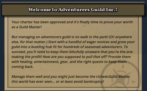 Adventurers Guild Inc. is a turn-based management game where you run the business behind the heroics! Hire staff, post quests, and fulfill adventurers' needs (while taking a cut). Manage your budget, build your reputation, watch adventurers scramble, and create the greatest guild of them all!