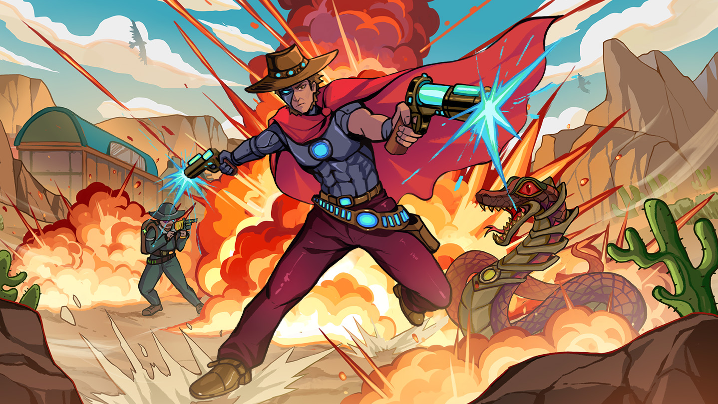• Blast through 5 worlds of wild west mayhem as a cybernetic cowboy!