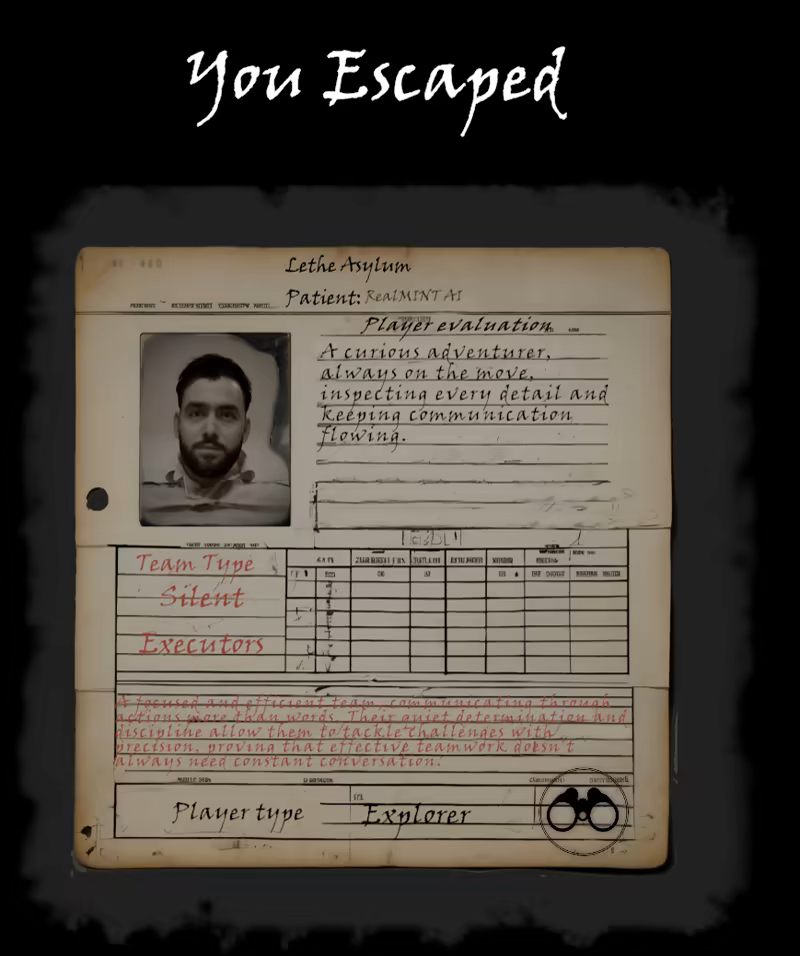 • Escape Room Player and Team Profiles: Your profile evolves based on your choices and performance, reflecting your escape skills and achievements. Whether solo or with a team, your journey shapes your identity in The Lethe with 10 player and 4 team profiles to uncover!