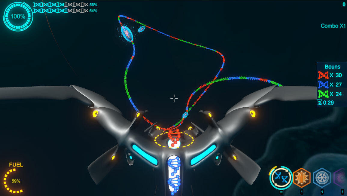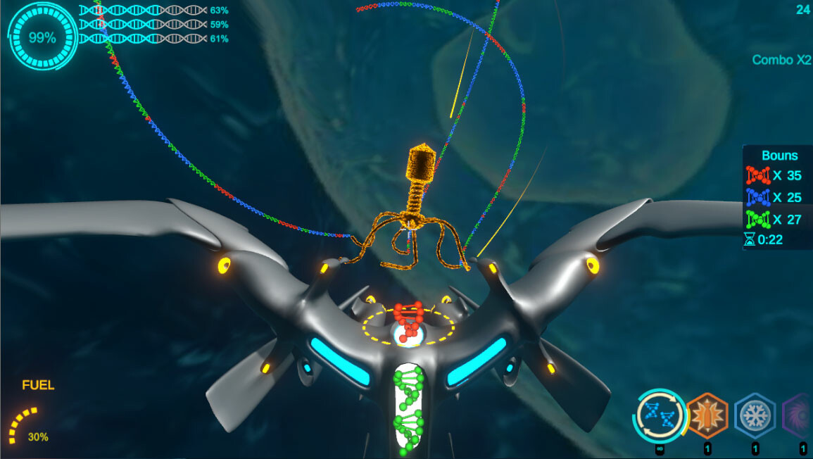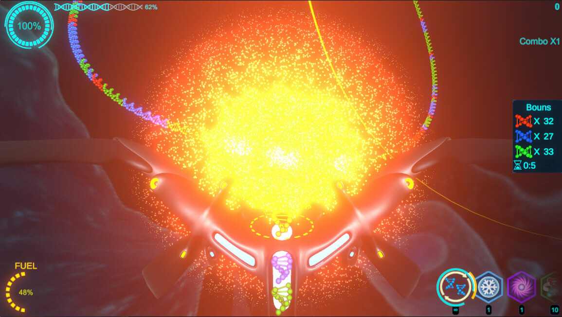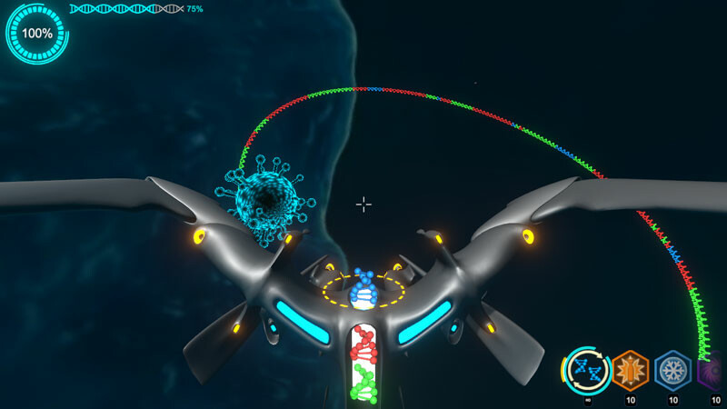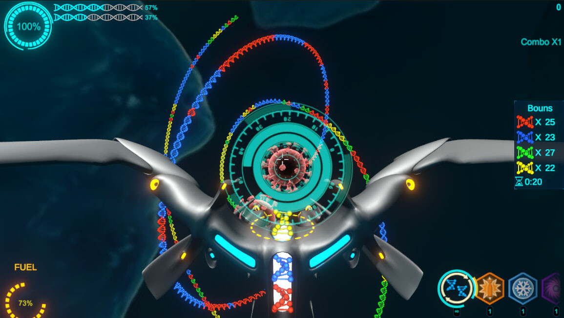By firing gene bullets, inserting them into the virus's gene chain, eliminating the same color and causing damage to the virus, higher scores can be obtained through combo attacks.