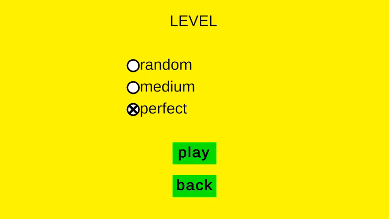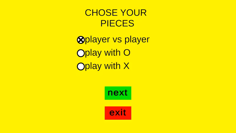 a new version of tic-tac-toe, in which a larger piece can occupy the space of a smaller one, with both player X and player O starting with 2 large pieces, 2 medium pieces and 2 small pieces to place on the board. Whoever completes a column, row, or diagonal first wins. If there is no space for a player to place his piece, or both players' pieces have run out, the game ends in an "velha" draw. You can either challenge a friend to play against you, or play against the computer, with 3 different levels for you to challenge, namely the random level, the intermediate level and the perfect level.