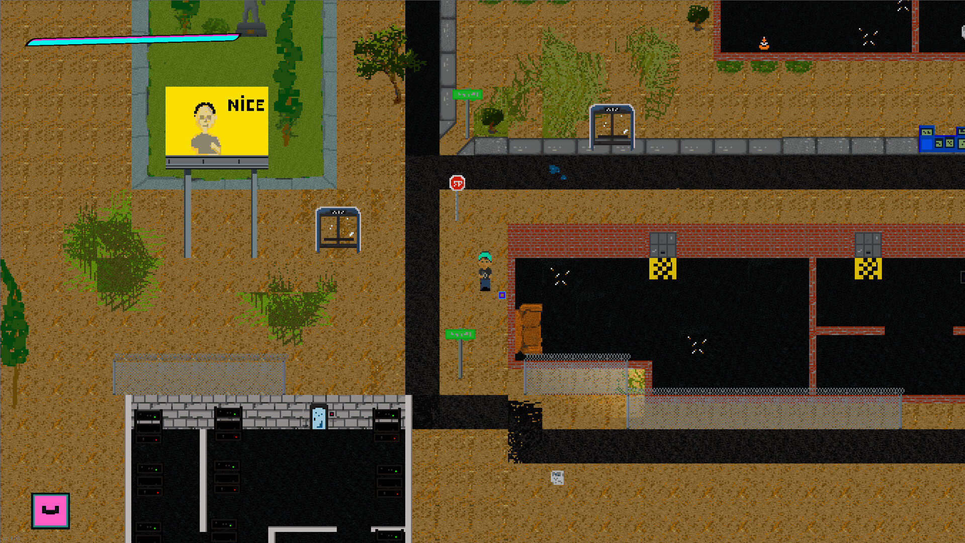 The game blends exploration, puzzle-solving, and twin-stick combat, wrapped in a pixel art veneer where information is both weapon and currency.
