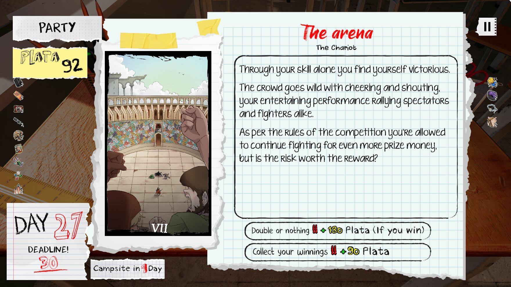 Choose your path. Face the consequences. Throughout each run, you’ll draw illustrated pages from a tarot-inspired adventure deck. These narrated events present tough choices, influenced by your current party, items, and past decisions.