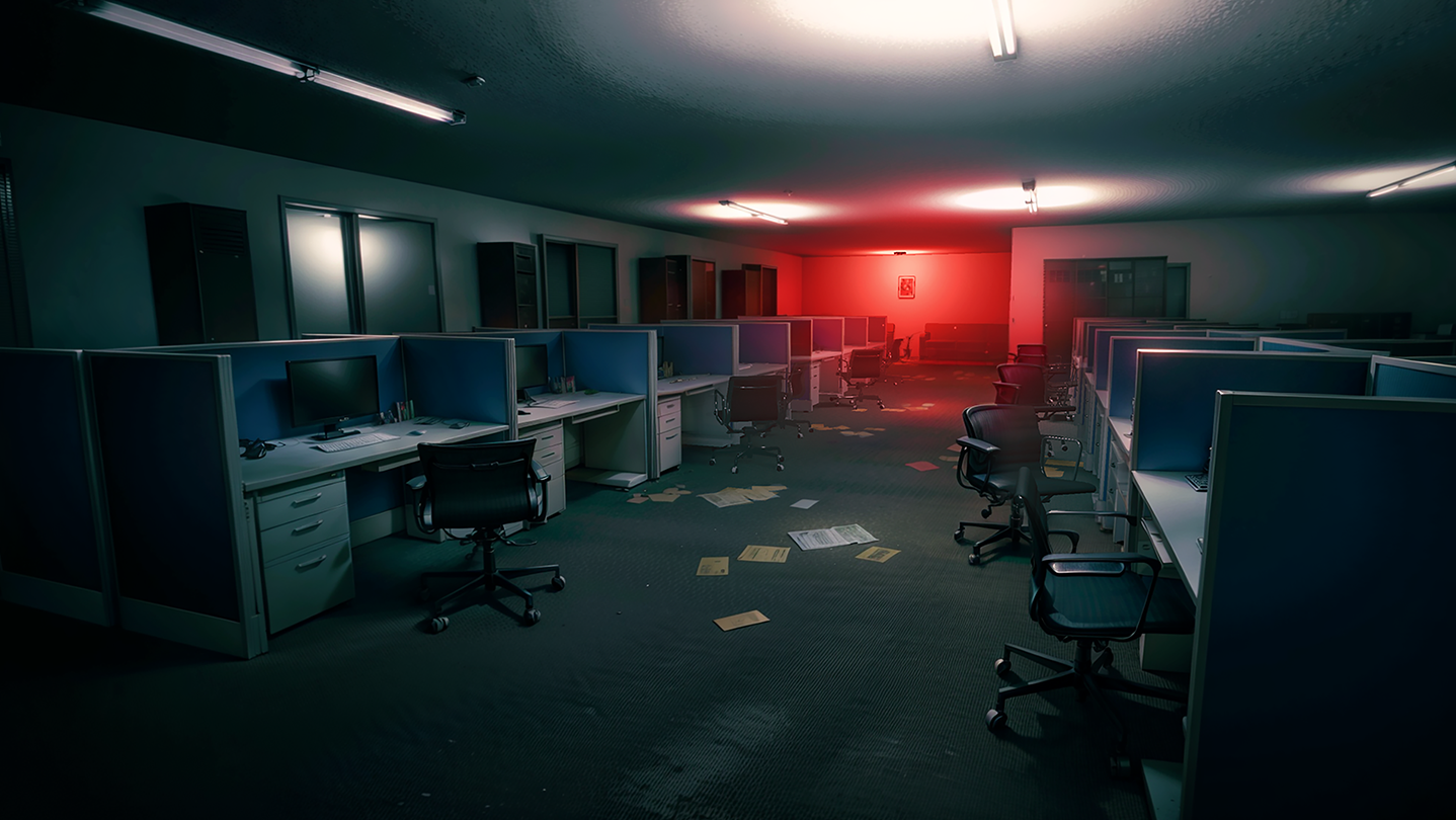 From scattered files to faint ghostly figures, the office evolves with every loop.
