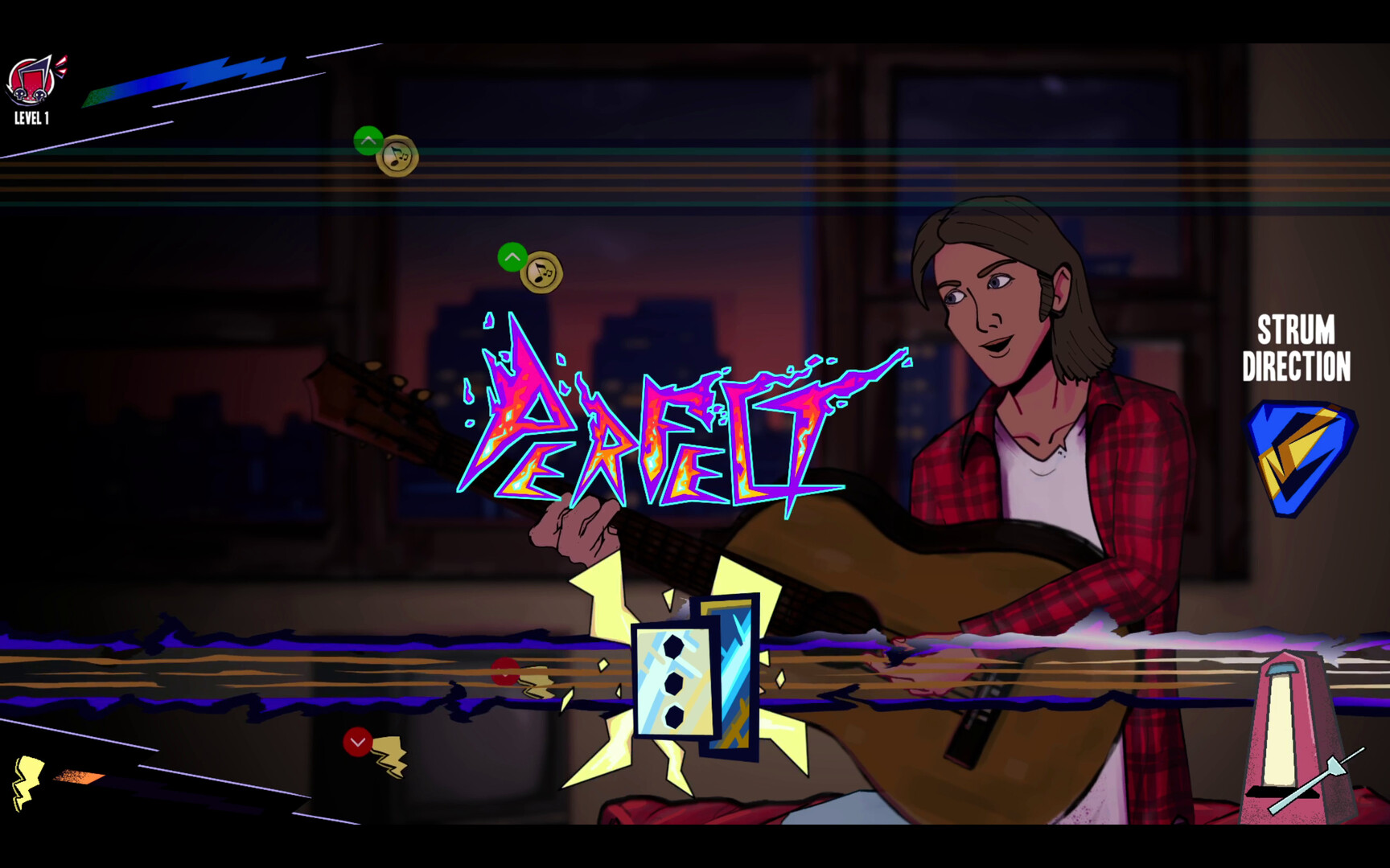 Grind your skills by practicing guitar! Earn cash and buy sheet music to learn new chords to write better songs.
