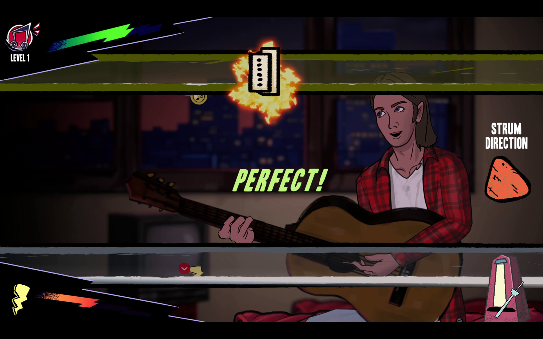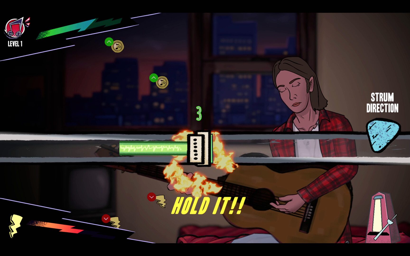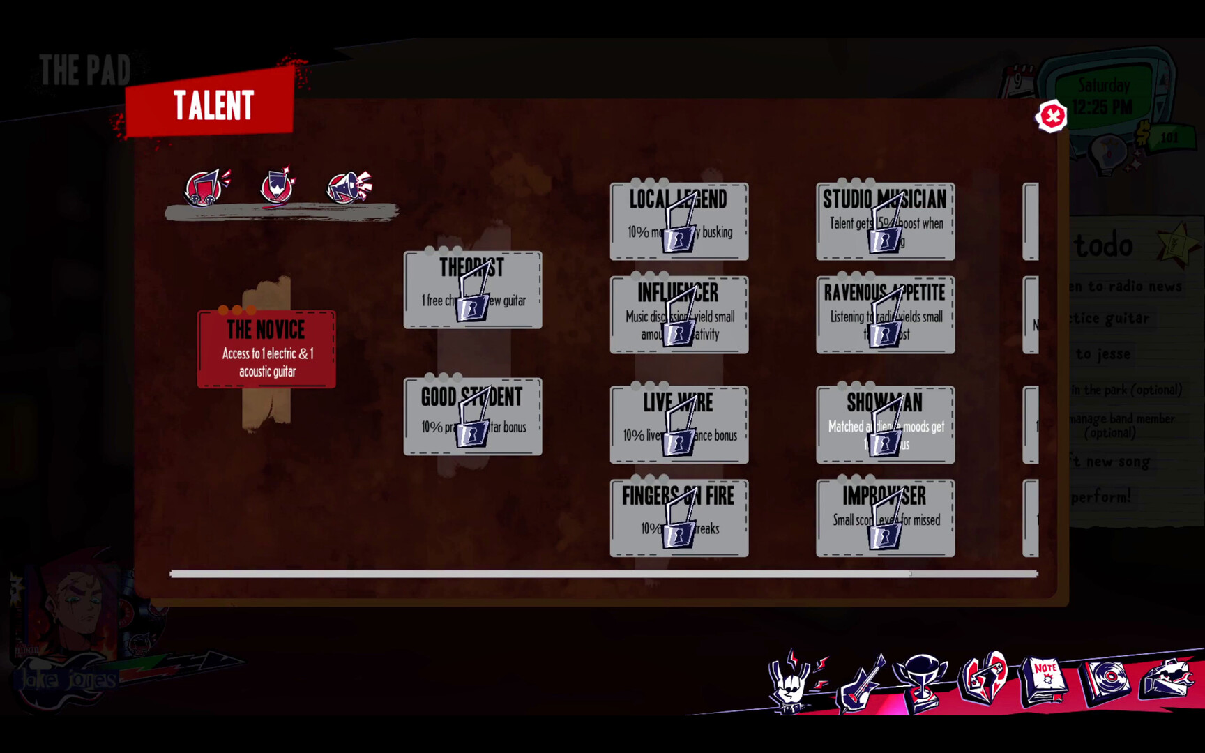 Grind your skills by practicing guitar! Earn cash and buy sheet music to learn new chords to write better songs.