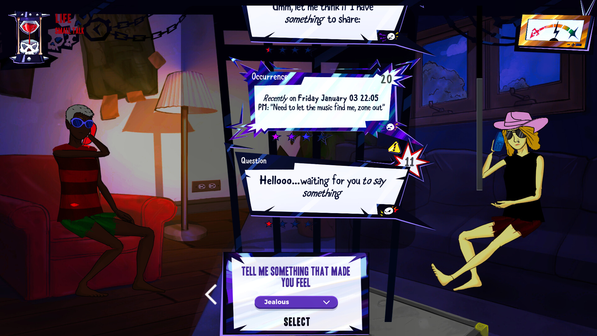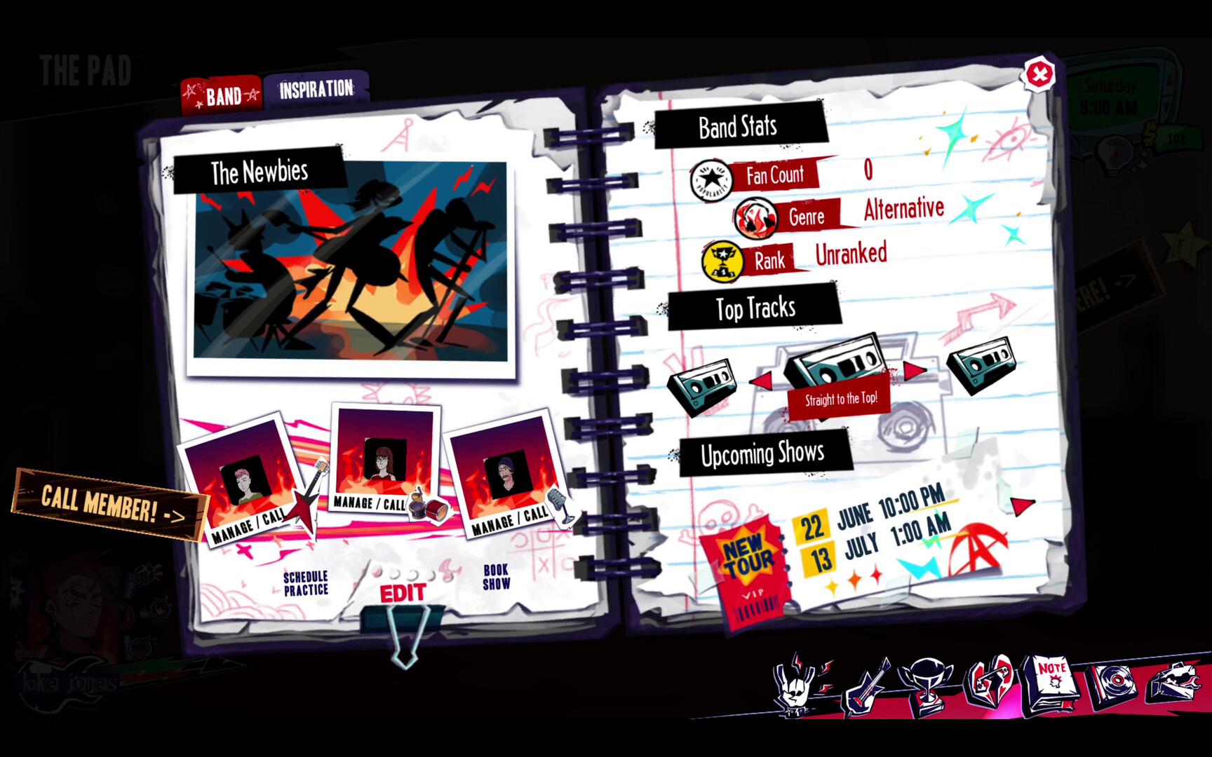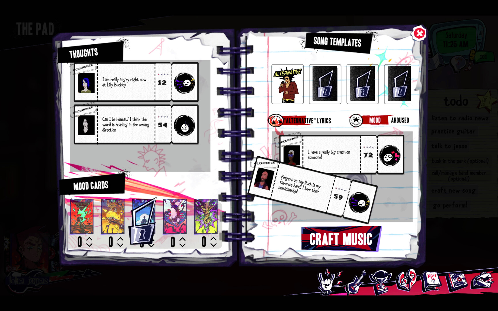 You'll use the things you learn about the world, other people, reactions, and moods from your notebook to talk to, influence, and build (or ruin) relationships. The secrets you can get them to share become the lyrics for your hit songs!