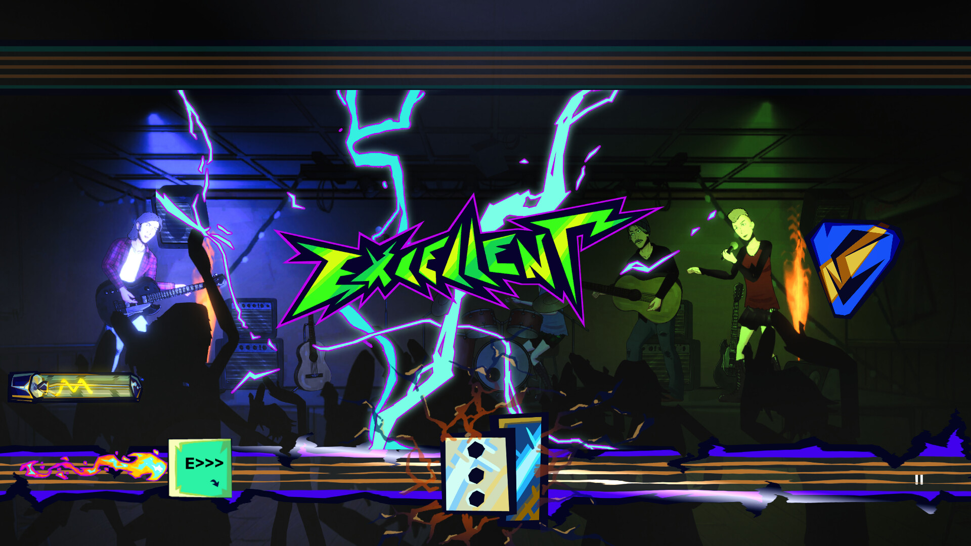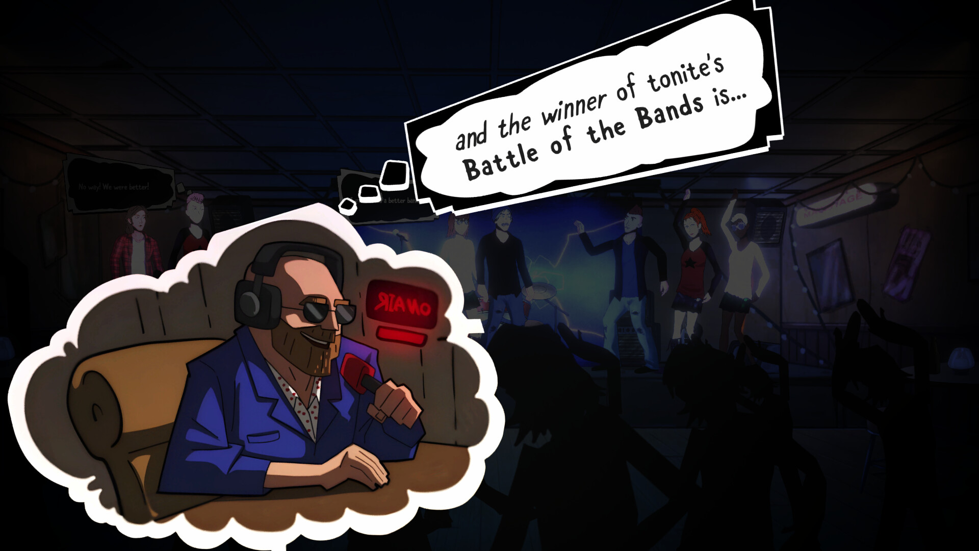 Compete in events against nightly traveling bands and the quarterly big boss local bands to become the top draw. Perform your bands greatest hits and wow the crowd. You'll have to read the room, play the songs that fit the mood of the audience. Then, while your rival performs, tune your guitars, mingle with the crowd to learn their thoughts, change your stage decorations, whatever it takes to achieve your dreams!