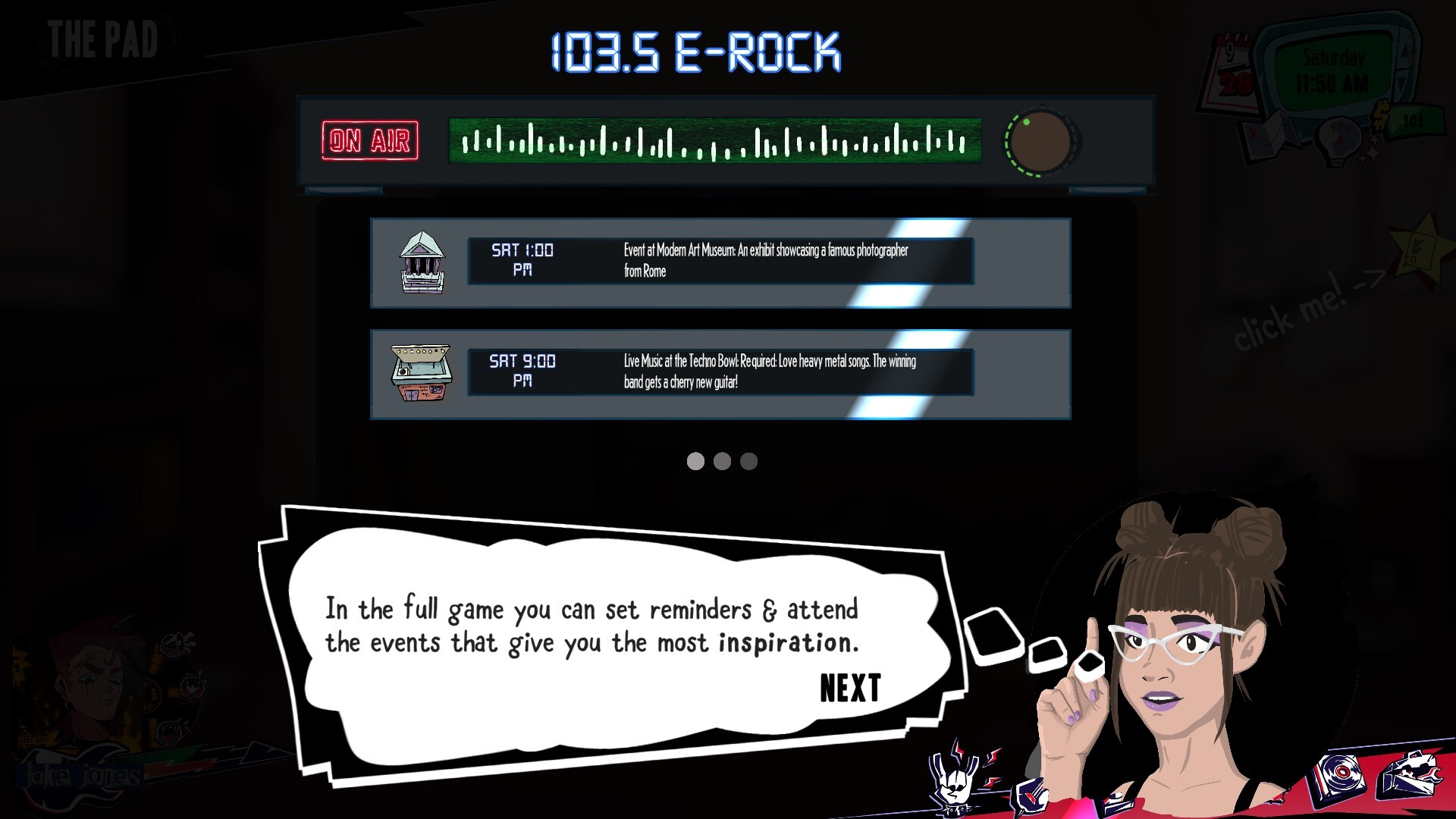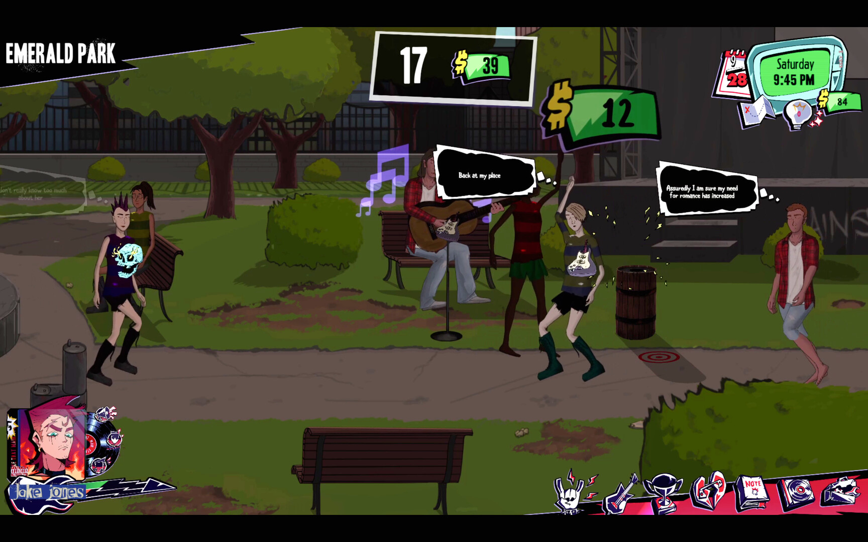 Tune into the radio to find the hottest events. Plan your day, manage your skills, gear, and relationships. Influence people, recruit band mates, and sometimes maybe even sleep. Head out and busk for cash, catch a movie, whatever inspires you. The world is open and only you can create your unique path to stardom. Every play through generates a new cast of characters that go about their lives you’ll need to engage with to gain the inspiration you, the artist, needs.