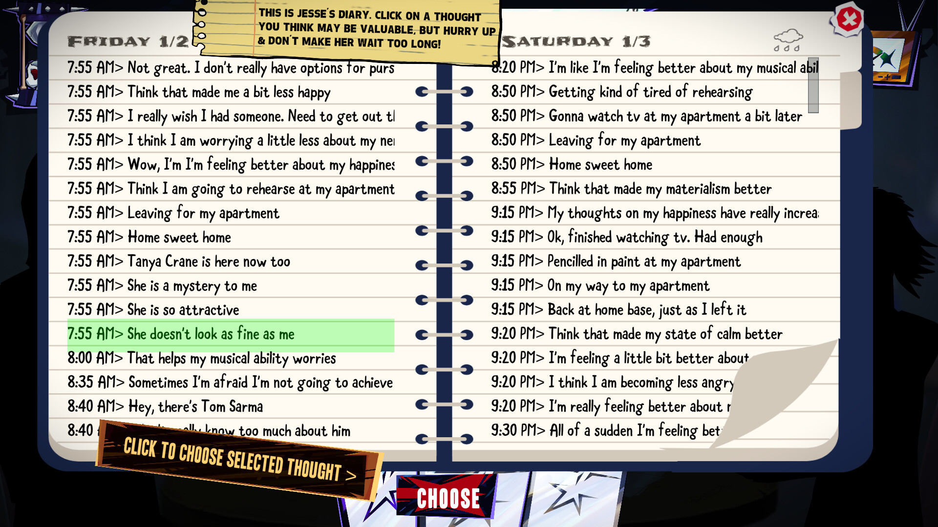 The people of the world generate thousands of thoughts they think constantly in their diary, all based off their unique personalities. Conversation battle to gain as much of them as you can!