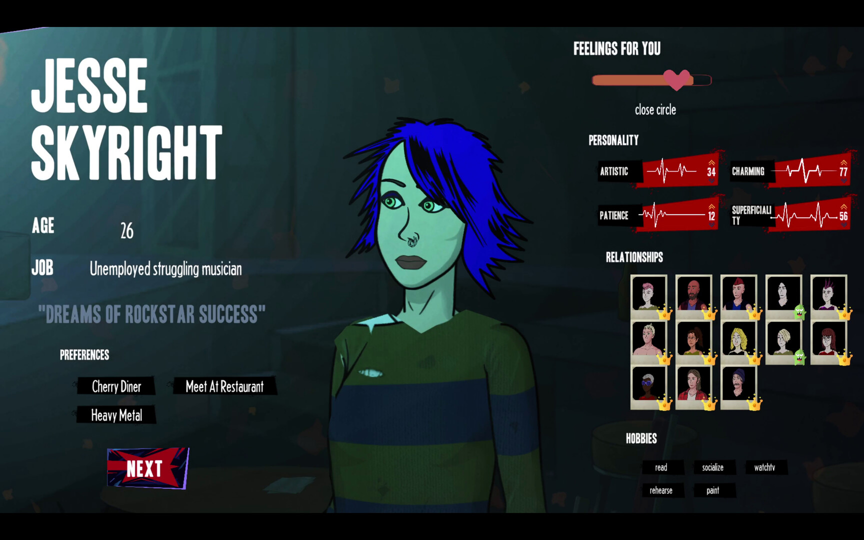 It’s 1992 in Emerald City. The world screams for change. Live the creative life and become the next big thing in the ultimate wannabe rockstar life sim! Level up your skills, craft & perform music, manage relationships & compete against your rivals in your quest to achieve your rockstar dreams!