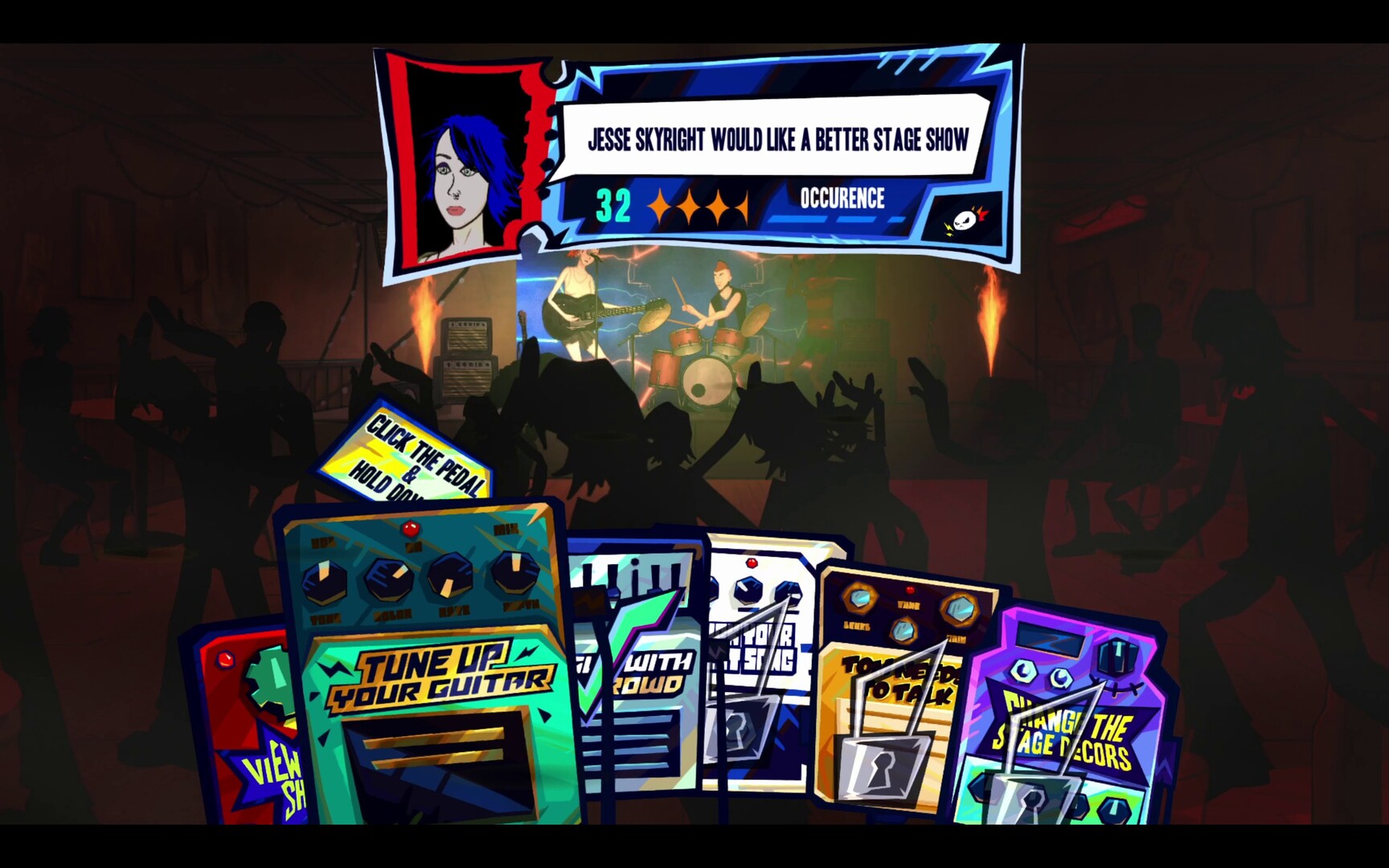 Do you want to be the top drawing live act? Focus on your guitar skills, on-stage charisma, and stage decorations. Or a world class songwriter/recording artist? Level up your song crafting skills and spend resources in the recording studio & on marketing.