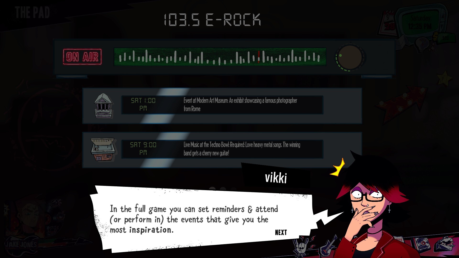 Tune into the radio to find the hottest events. Plan your day, manage your skills, gear, and relationships. Influence people, recruit band mates, and sometimes maybe even sleep. Head out and busk for cash, catch a movie, whatever inspires you. The world is open and only you can create your unique path to stardom. Every play through generates a new cast of characters that go about their lives you’ll need to engage with to gain the inspiration you, the artist, needs.