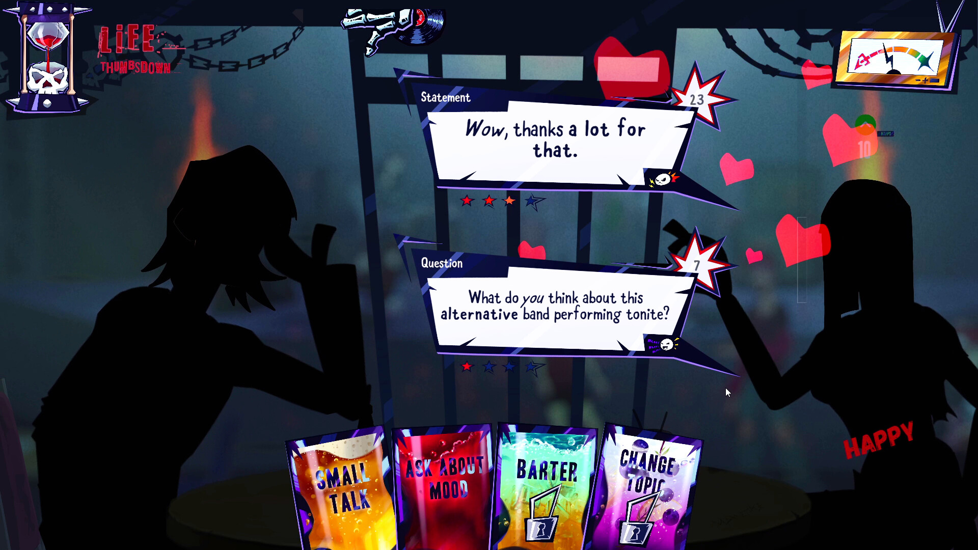 In Emerald City, talk isn't cheap — it's the inspiration you'll use as your song lyrics. Engage in high-stakes "Conversation Battles" to uncover secrets, moods, and thoughts from the city’s people. Every character maintains a dynamic diary of hundreds of thoughts based on their unique personality and daily moments. You'll need to manage your relationships well to unlock the most valuable of their secrets. The way you treat them will affect their responses, but also how they feel about you. Make them angry, you'll get angry thoughts. That's great for writing angry