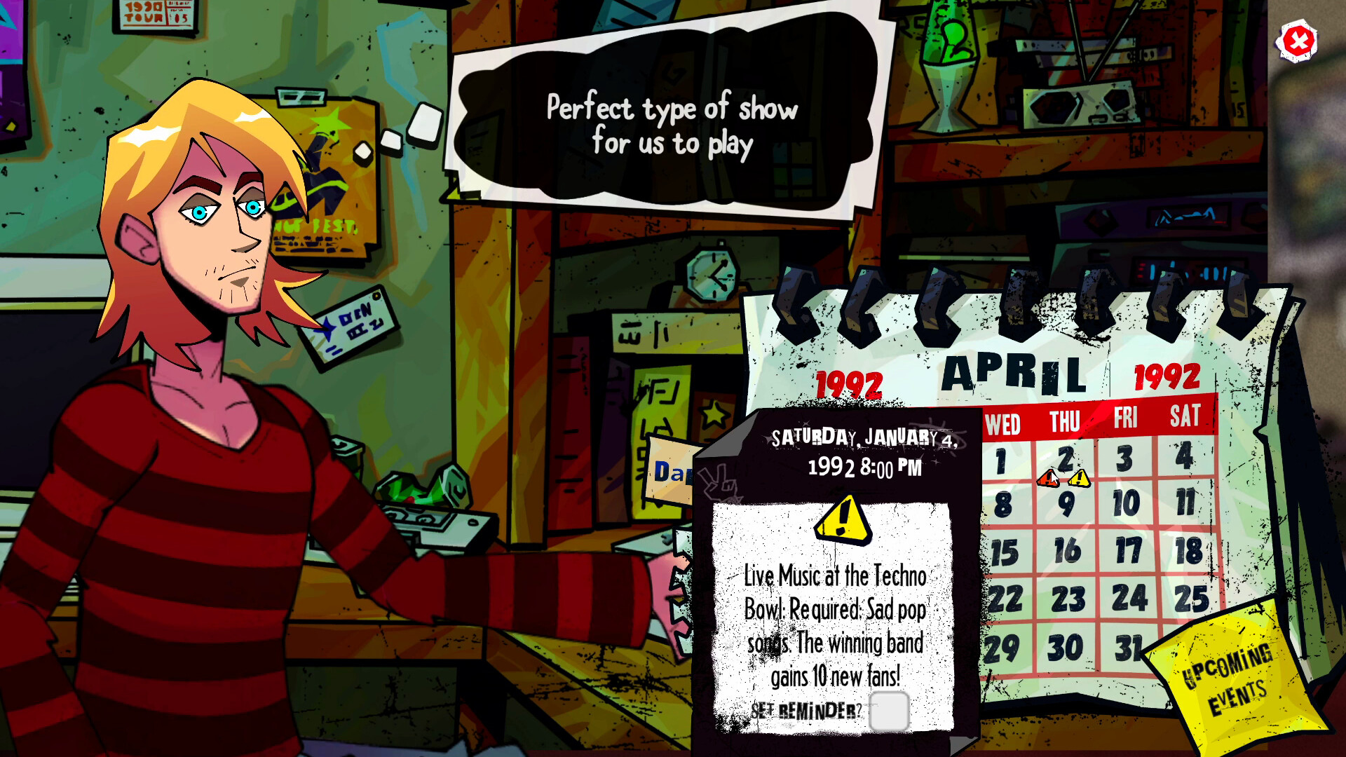 It's 1992 and the world is screaming for change. So you made the leap and moved to Emerald City. Now it's time to Take That Mainstage! In this hybrid genre life sim/crafting/strategy/rhythm game, you'll have one year to reach the top. It's up to you to recruit your perfect band, write music that moves people, conversation battle with your friends & enemies to collect lyrics, explore the city and it's mini-games, and battle other bands to reach the top of the charts 🎸