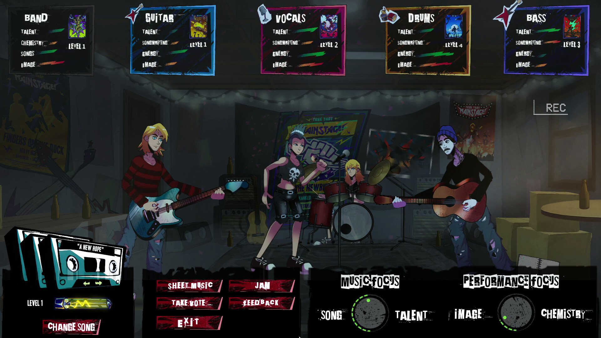 It's 1992 and the world is screaming for change. So you made the leap and moved to Emerald City. Now it's time to Take That Mainstage! In this hybrid genre life sim/crafting/strategy/rhythm game, you'll have one year to reach the top. It's up to you to recruit your perfect band, write music that moves people, conversation battle with your friends & enemies to collect lyrics, explore the city and it's mini-games, and battle other bands to reach the top of the charts 🎸