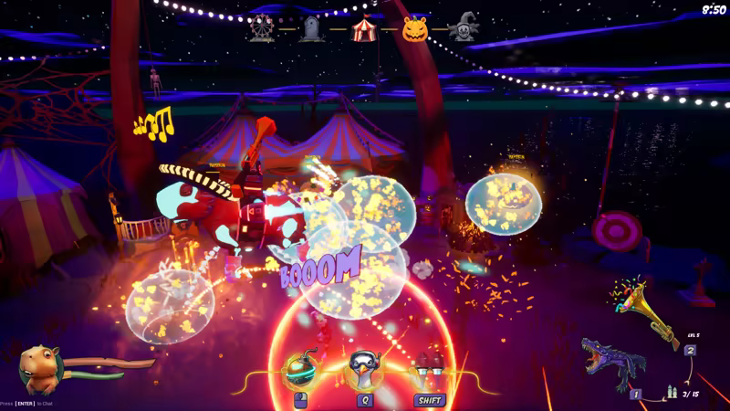 1. Welcome to the Carnival-themed demo of Capyverse Odyssey! Get ready to navigate spooky multiverses, fight enemies, and face the ultimate clown boss. Join forces with your first ally, the Seagull Squadron, and unleash chaos with special abilities and powerful weapons.