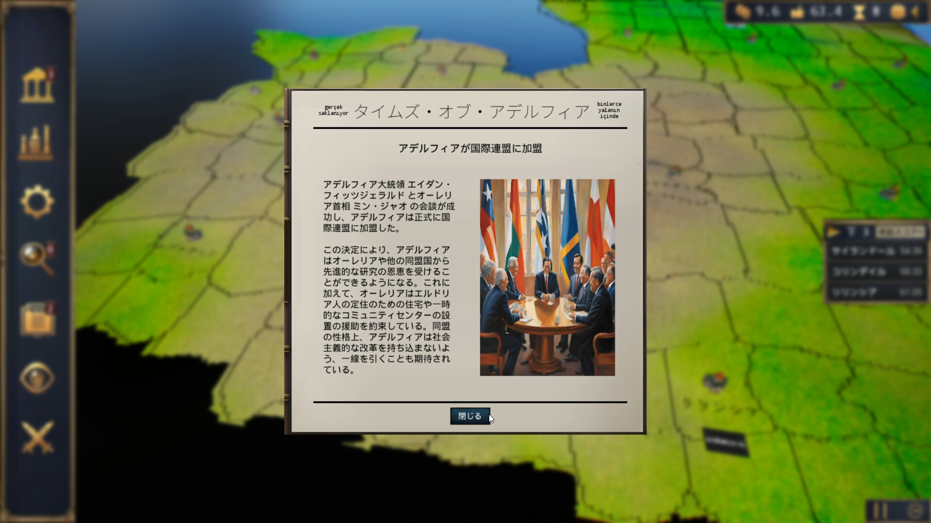 アデルフィアの自由闘争におけるあなたの役割は歴史書に刻まれ、あなたは満場一致でアデルフィア初代大統領に就任した。しかし、忍耐は薄れ、好意はめったに忘れられず、もしあなたが高尚な期待を下回るようなことがあれば、人々は躊躇なくあなたを交代させるだろう;