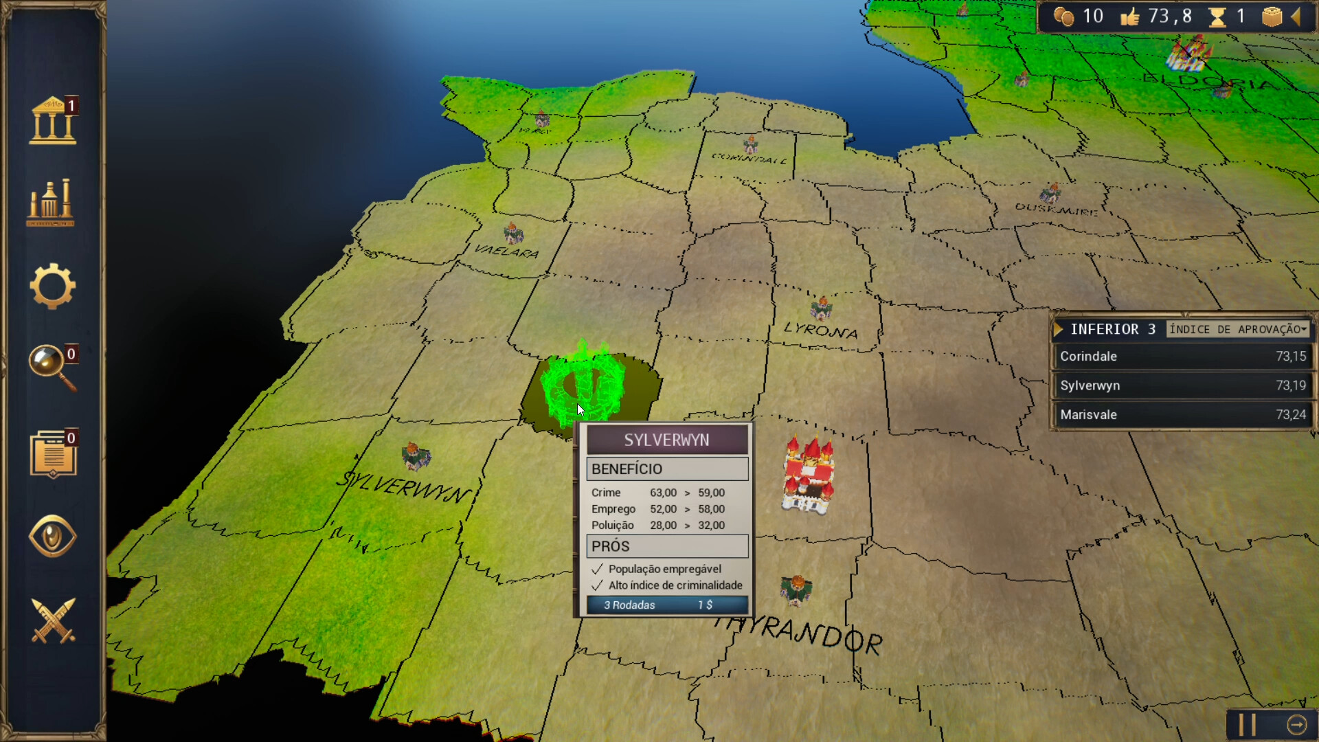 • Público geral : O público em geral de cada província espera que você ofereça um padrão de vida decente em todas as métricas (emprego, segurança etc.). Se isso não for feito, haverá uma queda nos índices de aprovação, o que levará à sua eventual expulsão nas próximas eleições
