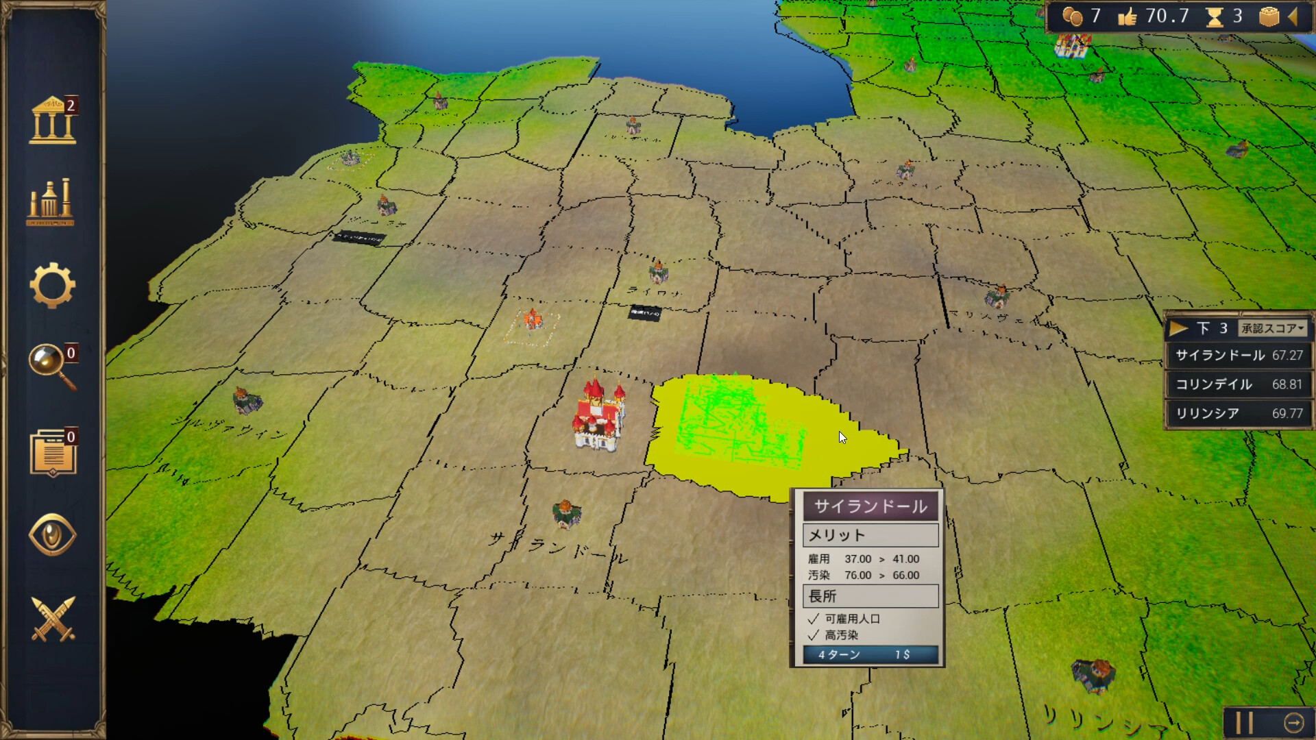 • 1ターンに1アクション : 1ターンに1つの行動(建設、政策決定、研究開発予算の調整など)しかできないため、相反する利益の間で優先順位をつけることが重要になる