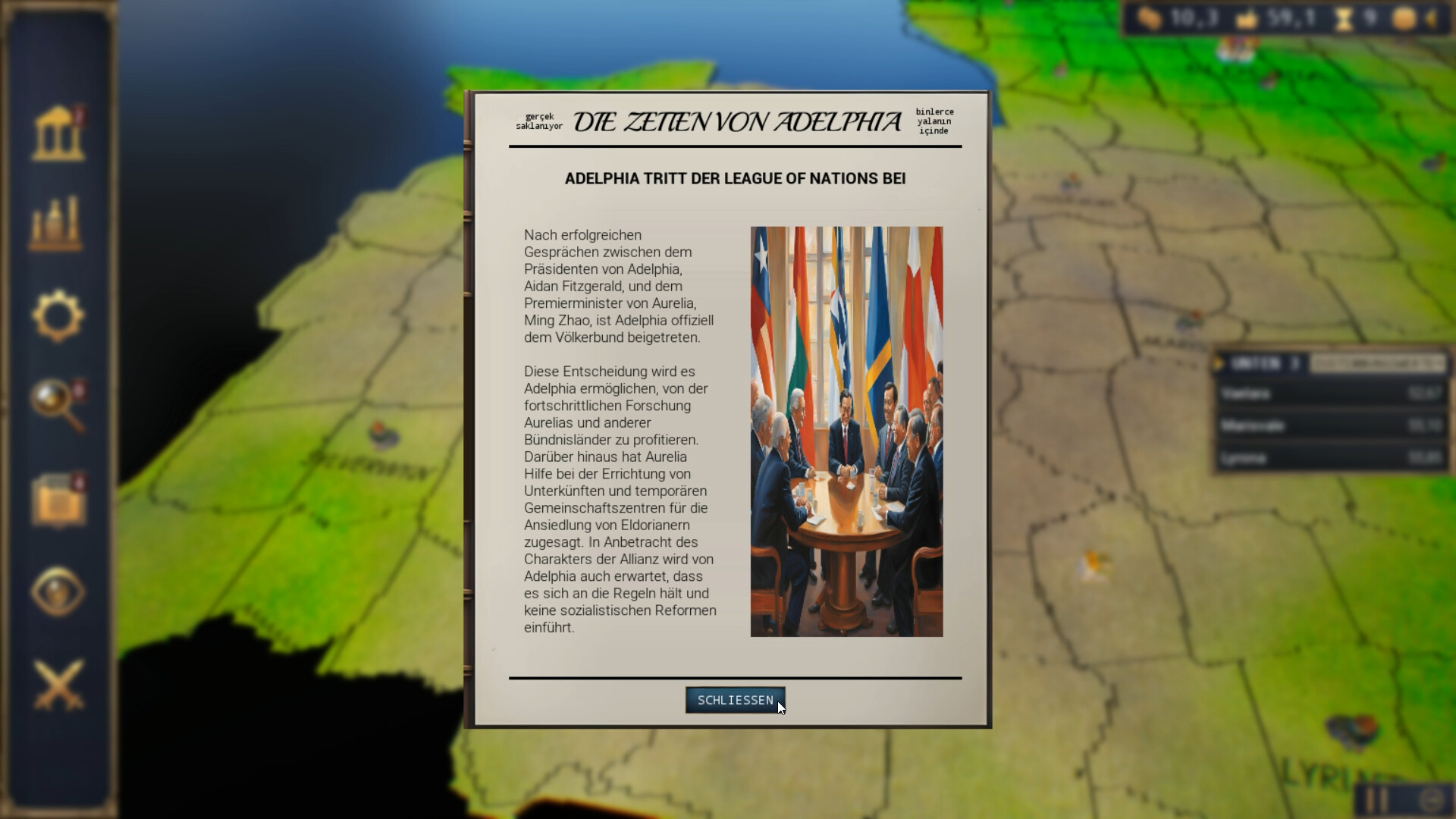 Ihre Rolle im Freiheitskampf von Adelphia ist in die Geschichtsbücher eingraviert und hat Ihnen eine einstimmige Amtszeit als erster Präsident von Adelphia eingebracht. Doch die Geduld geht zu Ende, Gefälligkeiten werden selten in Erinnerung gerufen und die Leute würden nicht zögern, Sie zu ersetzen, wenn Sie ihre hohen Erwartungen nicht erfüllen würden;