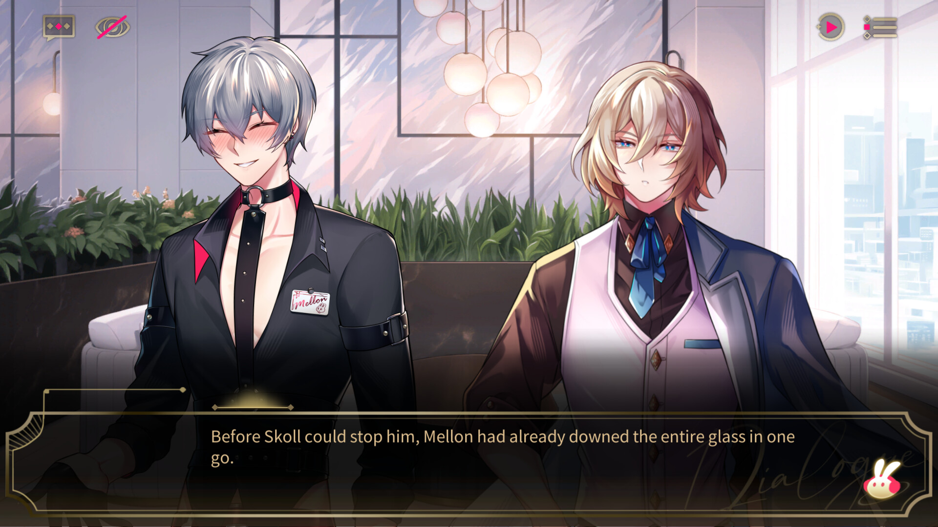 This is a BL adult game.In a Dom/Sub modern society, Skoll, a Switch, visits an exclusive club to ease his physical needs. There, he meets Mellon, a Dom. What begins as a purely physical connection within the club soon becomes far more complicated.