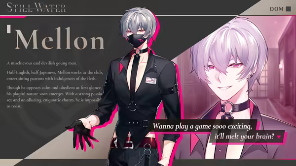 This is a BL adult game.In a Dom/Sub modern society, Skoll, a Switch, visits an exclusive club to ease his physical needs. There, he meets Mellon, a Dom. What begins as a purely physical connection within the club soon becomes far more complicated.