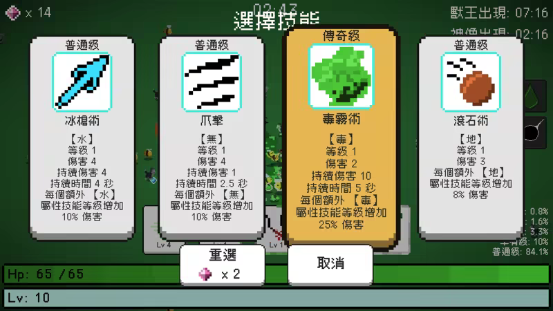 升級時將獲得一次取得新技能或升級現有技能的機會,如果對抽取的技能不滿意,可以用[進化石]來重新進行抽取。