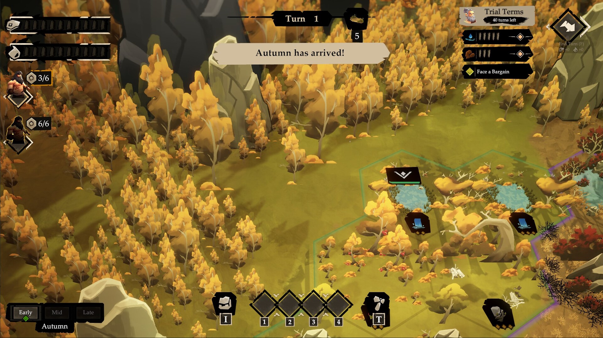 Summer feeds you, autumn leans on your stores. Bogs slow your steps, frost closes paths, and drought steals your water. Each shift changes what tiles can offer and which routes make sense, so a path that was safe a few turns ago may no longer be worth the cost.