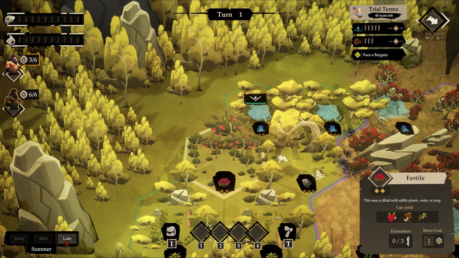 Summer feeds you, autumn leans on your stores. Bogs slow your steps, frost closes paths, and drought steals your water. Each shift changes what tiles can offer and which routes make sense, so a path that was safe a few turns ago may no longer be worth the cost.