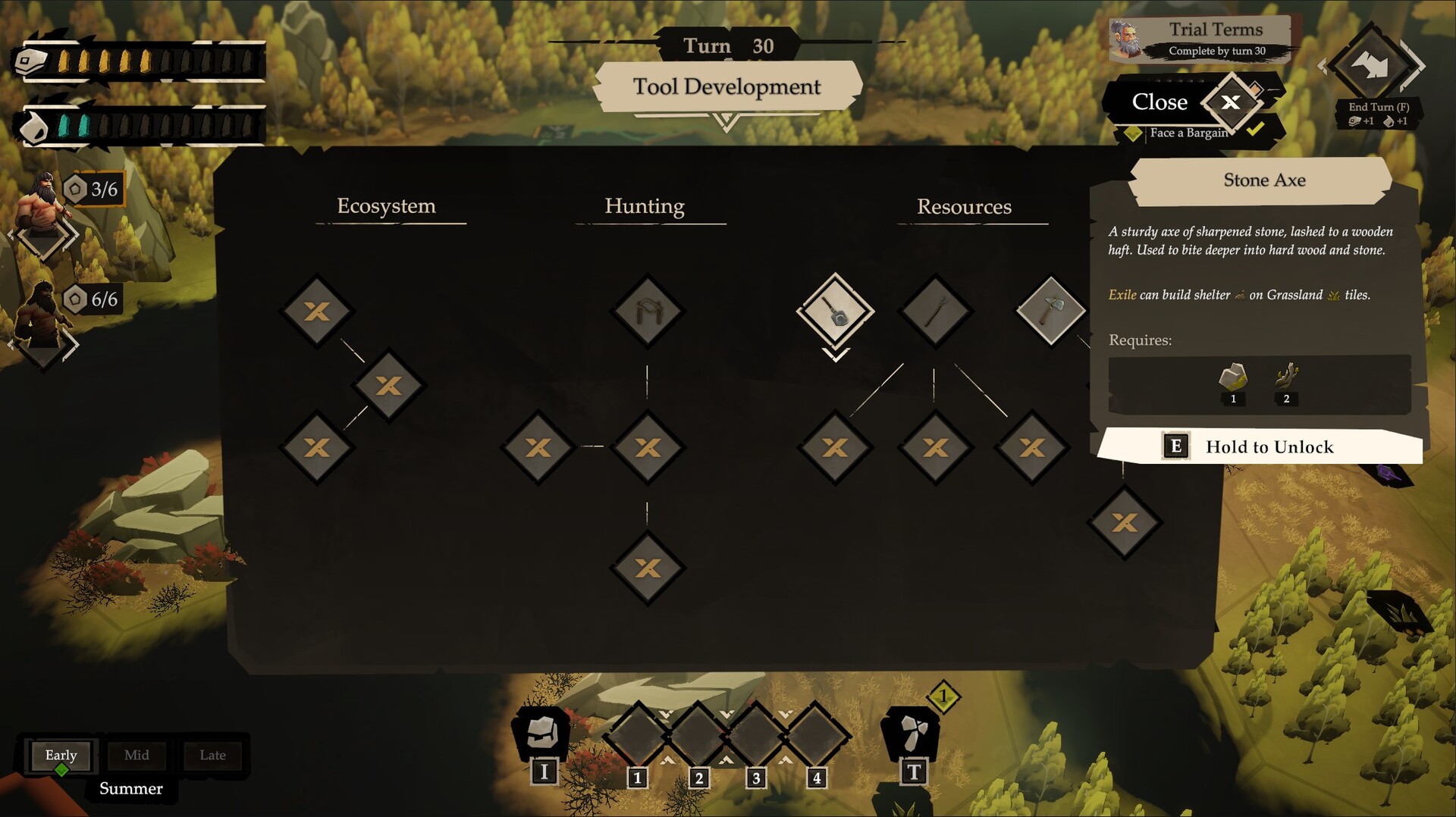 Gather With Purpose: Food, water, and materials are never guaranteed. Tiles deplete and can return in new forms. Over time you learn how each area of land tends to cycle. Push too hard and tiles slip into barren grassland, weakening yields and stressing their local area. Restore worn ground to keep the cycle flowing. Seasons change what is available and when, so your gather plan shifts from summer abundance to autumn scarcity. Many actions offer a real tradeoff: take more now and strain the land, take less to keep the area steady, or invest extra effort to improve what the tile becomes next.