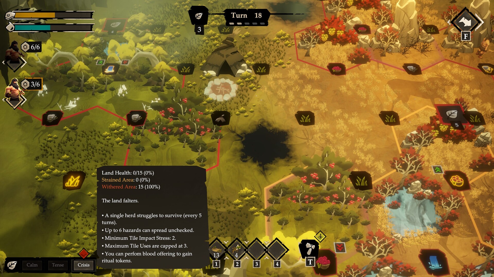 Secure Your Gains: Your hard-won resources are never safe. Animals claim what they need, consuming food and water you worked to grow. Stop them too often and they starve, leaving tiles depleted. Hazards strike struggling areas, blocking access but opening new ways to interact through tools. Protect what matters, allow what must flow, and decide what you are willing to lose.