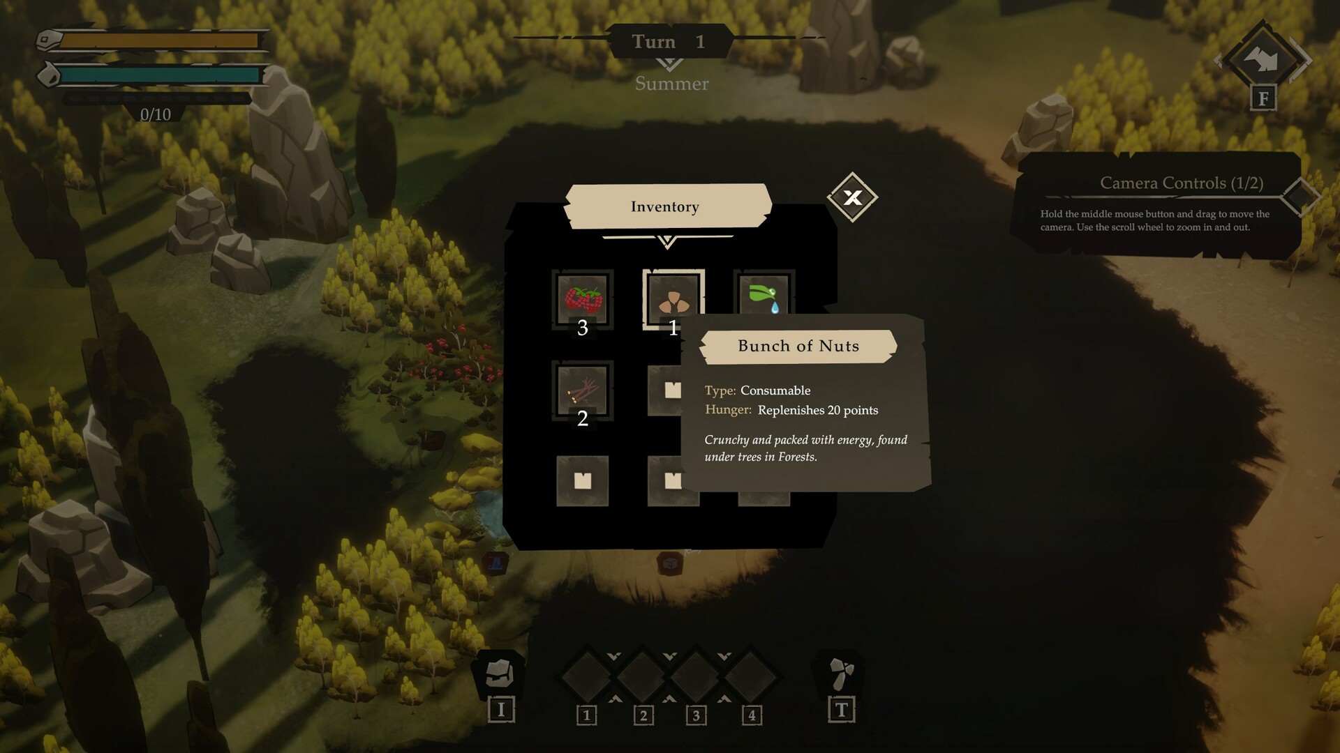 Gather With Purpose: Food, water, and materials are never guaranteed. Tiles deplete and can return in new forms. Over time you learn how each area of land tends to cycle. Push too hard and tiles slip into barren grassland, weakening yields and stressing their local area. Restore worn ground to keep the cycle flowing. Seasons change what is available and when, so your gather plan shifts from summer abundance to autumn scarcity. Staying alive, progressing your tools, and keeping the land that feeds you in reasonable shape are all part of the same decision.