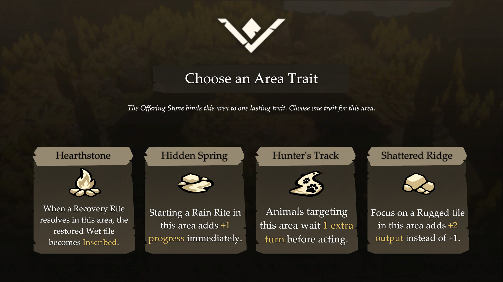 Areas track how you use them. Push too hard and yields weaken, pressure rises, and recovery becomes harder. Restore worn ground, manage local pressure, and rotate your rites if you want the land to keep providing through the trial.