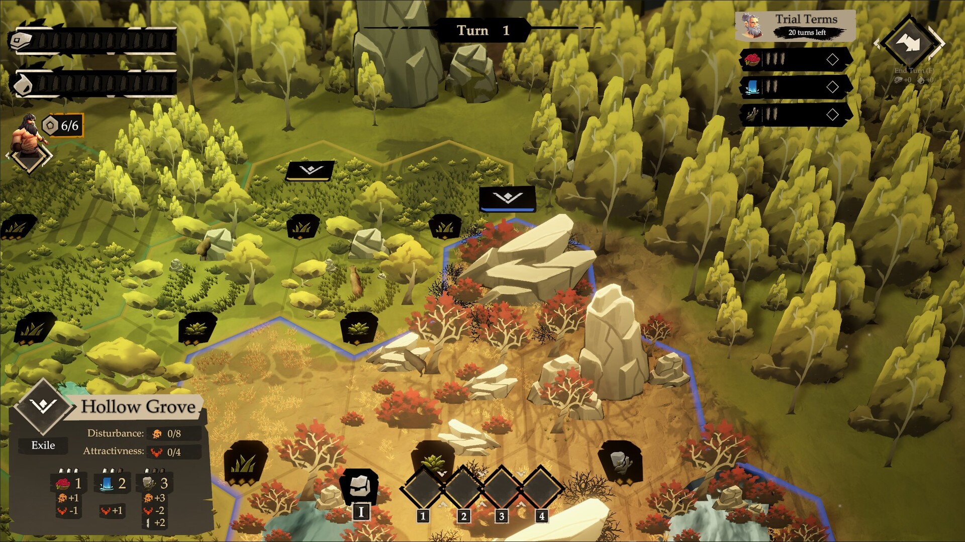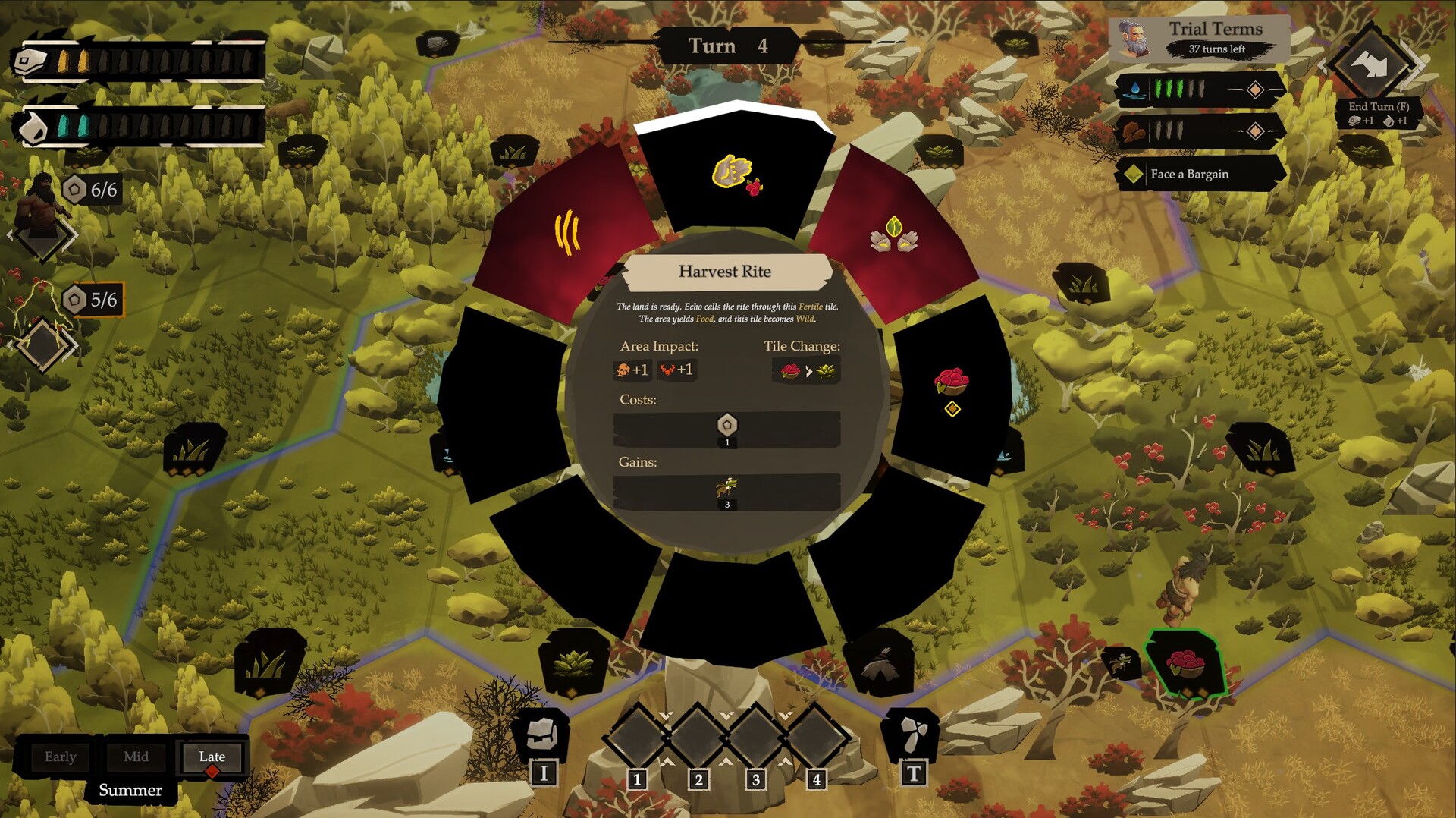 Gather With Purpose: Food, water, and materials are never guaranteed. Tiles deplete and can return in new forms. Over time you learn how each area of land tends to cycle. Push too hard and tiles slip into barren grassland, weakening yields and stressing their local area. Restore worn ground to keep the cycle flowing. Seasons change what is available and when, so your gather plan shifts from summer abundance to autumn scarcity. Many actions offer a real tradeoff: take more now and strain the land, take less to keep the area steady, or invest extra effort to improve what the tile becomes next.