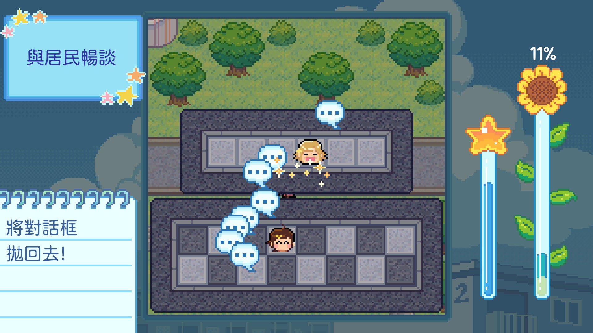 有些居民因故無法參加夏日祭。但只要完成小遊戲,他們或許就會點頭答應?夏日烈陽把溜滑梯曬得熱烘烘的,吃掉用溜滑梯煎成的荷包蛋……在水坑搓泥球……正專心用竹掃把打掃的竹爺爺,又該怎麼說服他參加呢?