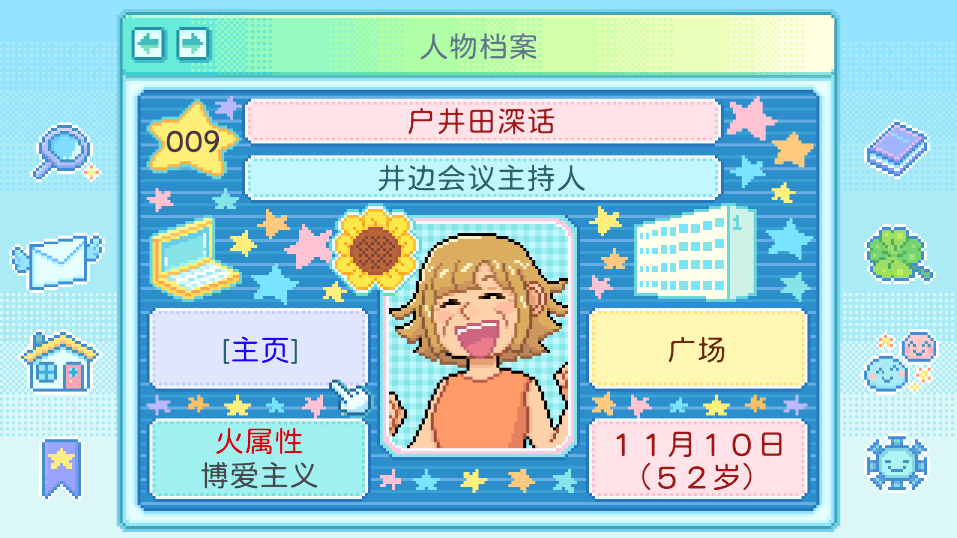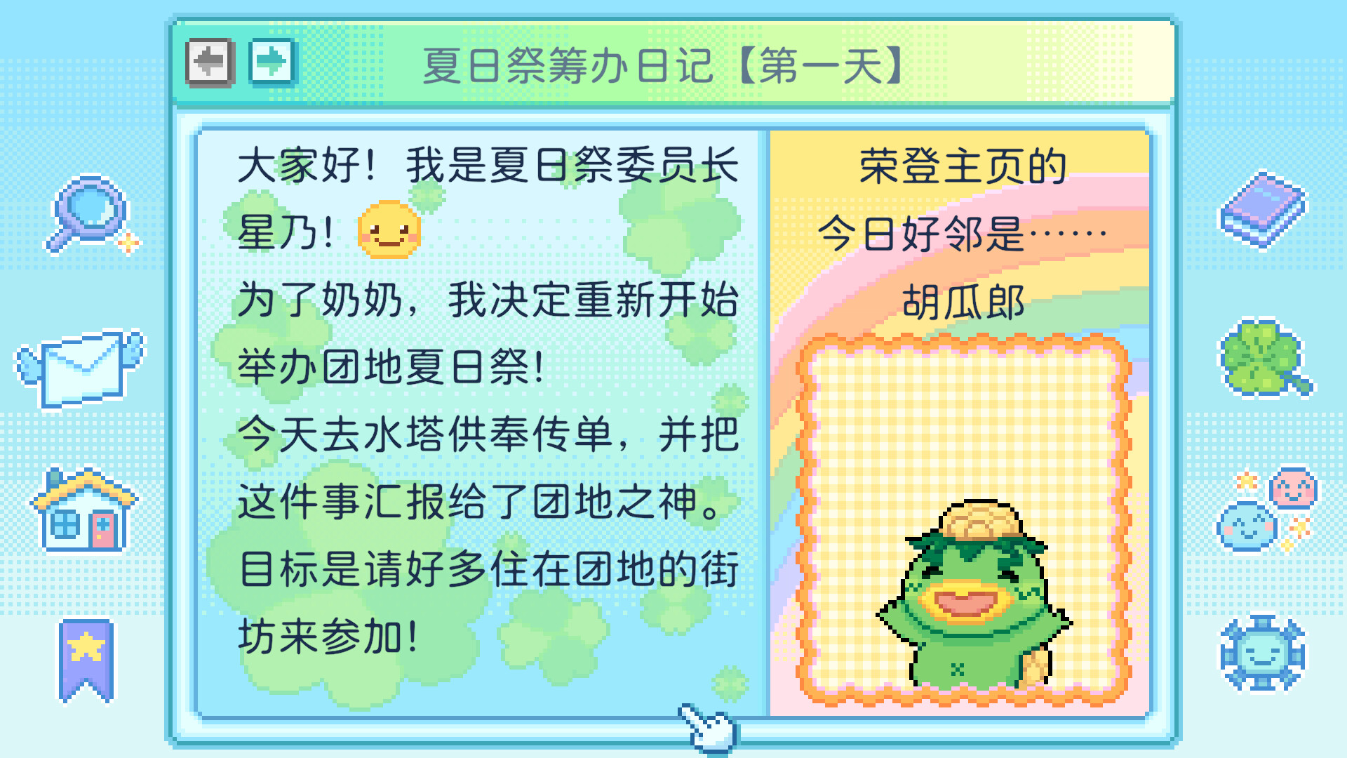 如果能看到很多人来参加,奶奶的病情应该也会有好转吧?用电脑在网络上收集情报,通过小游戏来探索团地,去邂逅更多个性丰富的居民与不可思议的奇遇!小小的居民团地,大大的暑假冒险!