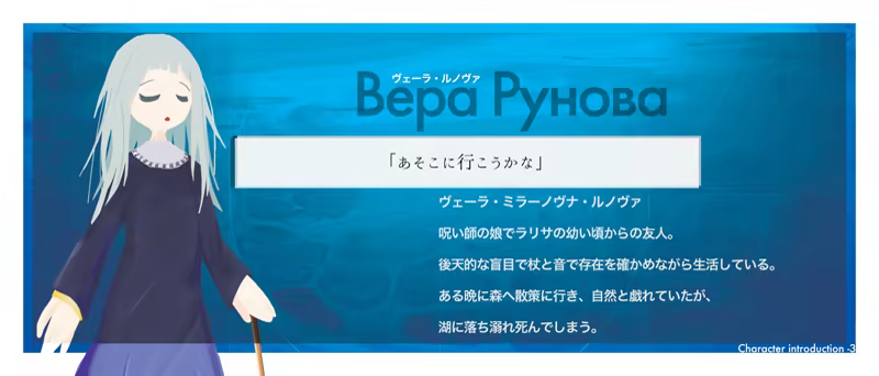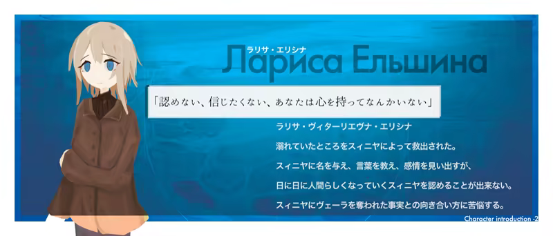 Larissa Elshina met a deformity with the face of her missing friend. She gives it the name of Sinyaya and teaches it language. She develops feelings and grows. Like a human being. What remains at the end of the girls' blue play?