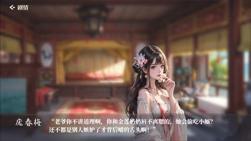 以魂穿成为西门庆为视角,通过他与妻妾情人们的情感纠葛和生活经历,感受现实社会与人性善恶的同时,通过不同的剧情选项,让自身在穿越后存活下去并最终确认是否回归到穿越前。