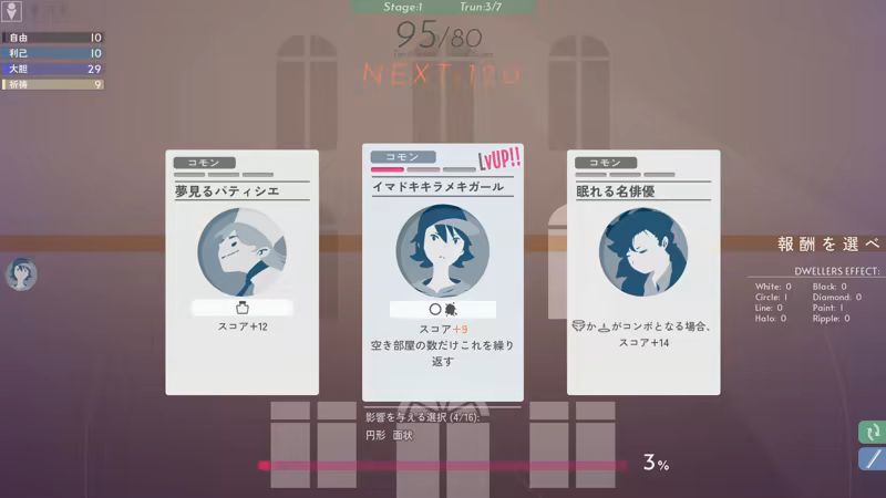 住人はそれぞれ個別の能力と条件を持ち、カードの選択に影響を与えます。