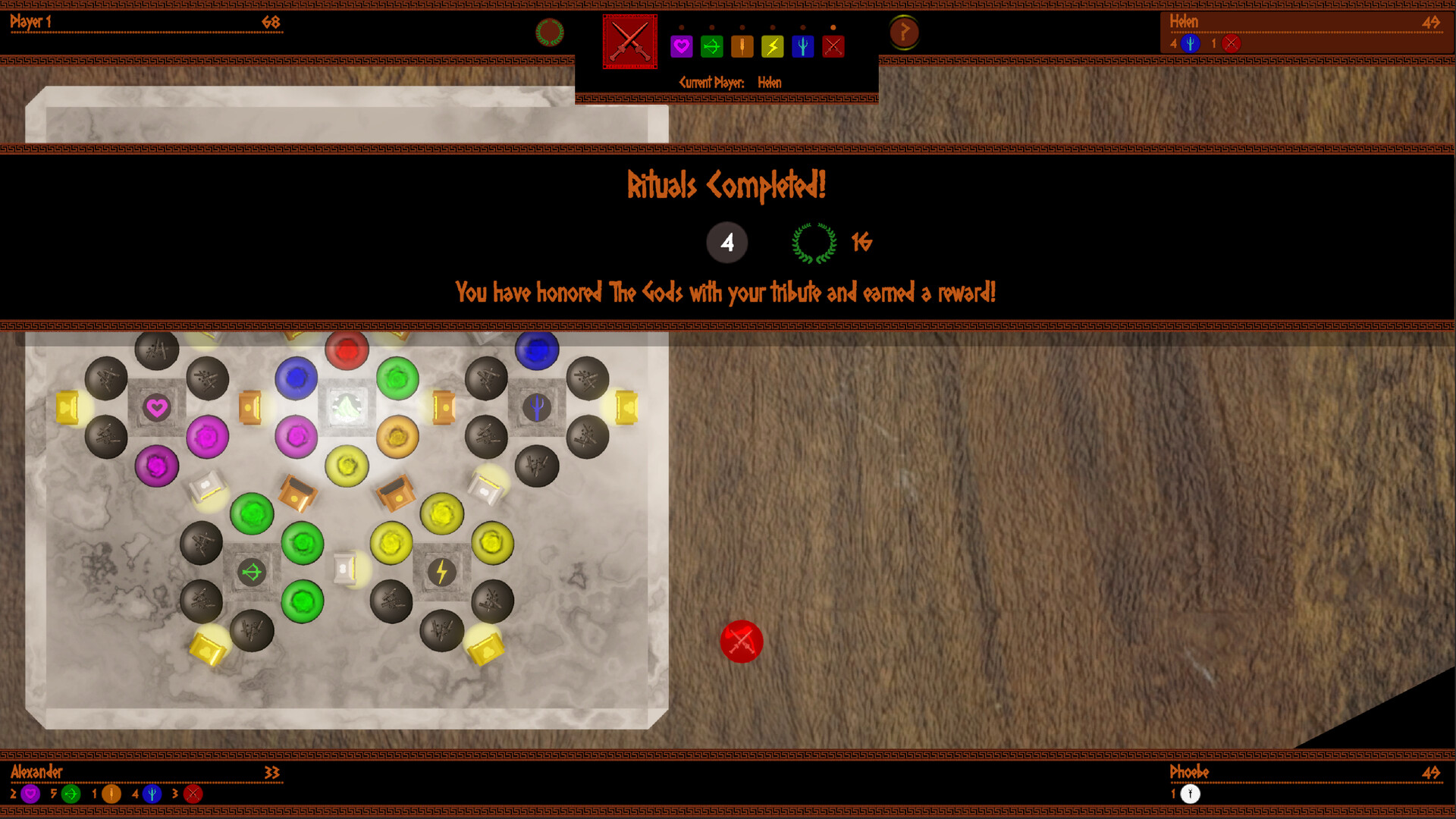 Olympia: Festival of the Gods is a digital board game where players collect tokens in order to perform rituals to honor the Gods of Ancient Greece! Players can compete against other players in local PVP, or against AI bots.