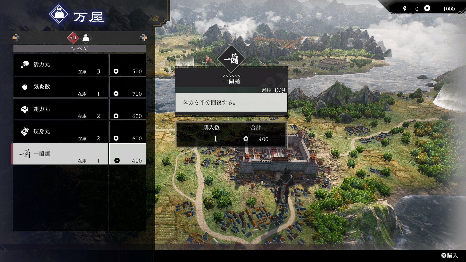 戦闘中に体力を回復できる携行品「一蘭麺」を、万屋で購入できるようになる追加コンテンツです。