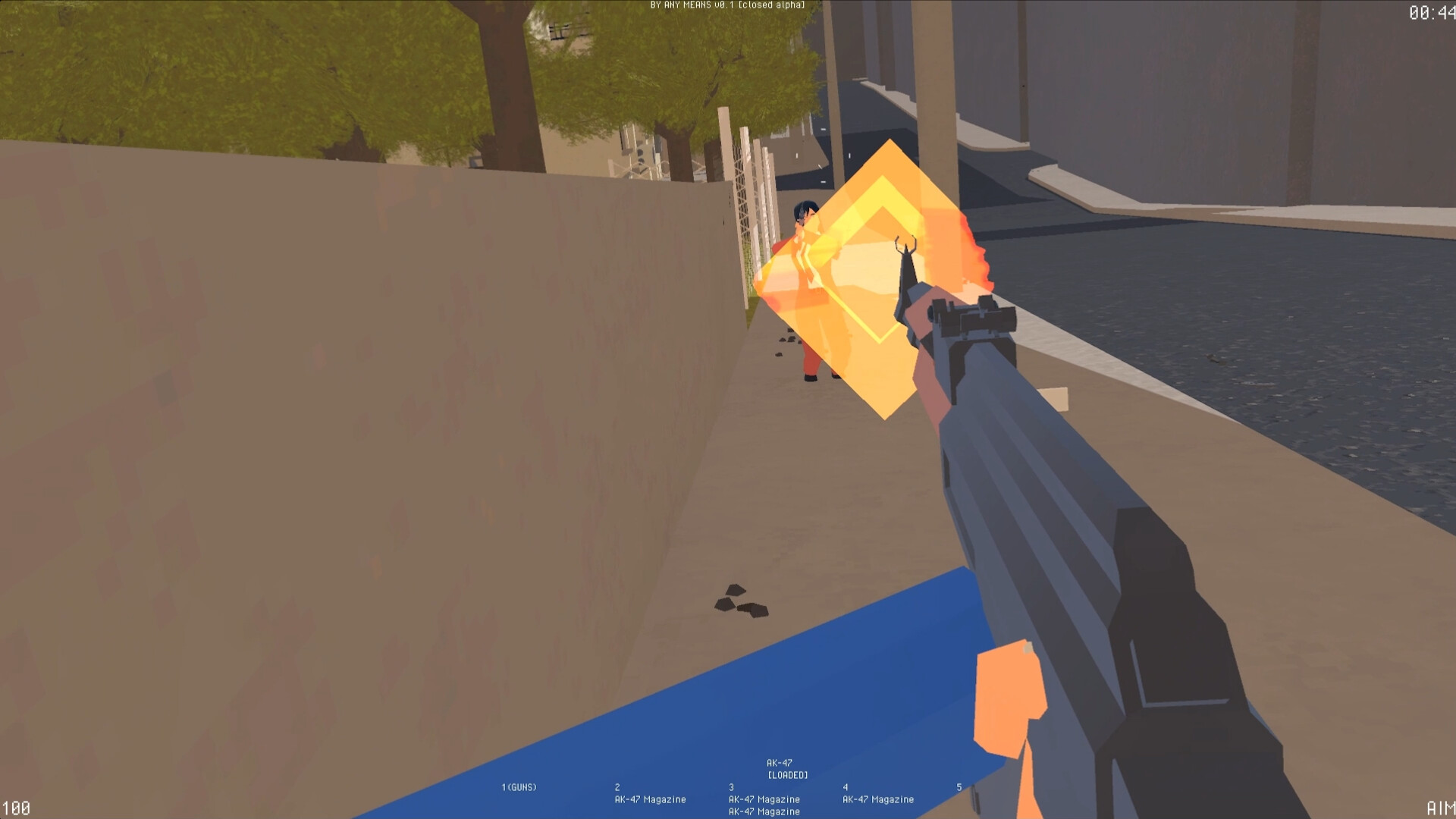 “Currently the game has only a unfinished round mode. Players may join and fight eachother in a round based team deathmatch mode, where they spawn with a random gun and the single goal to kill the enemy team. The last team alive before the timer runs out wins.”