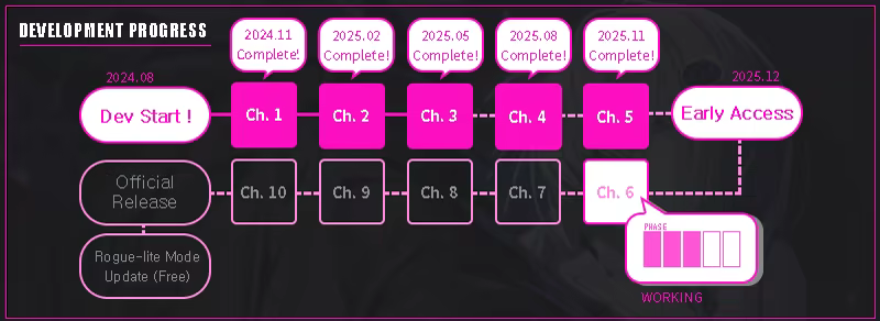 “The current Early Access build is fully playable and contains the main story through Chapter 5 of the planned 10 chapters. All core gameplay systems, including combat, progression, and dialogue mechanics, are already implemented and functional. Future updates are planned to add the remaining story chapters, further content, and performance optimizations.”