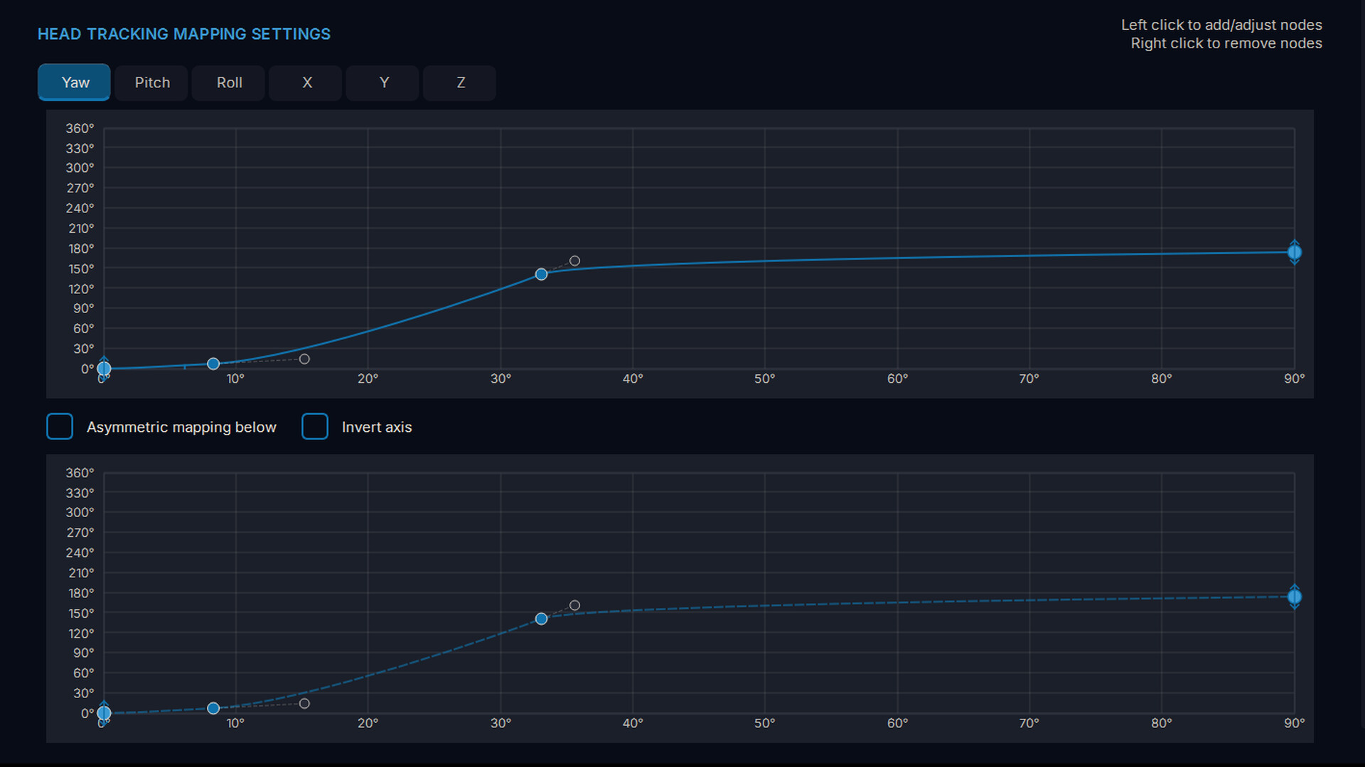 Head Tracking Settings: Toggle axes; set input→output mapping per axis; tune smoothing, deadzones, and confidence threshold.