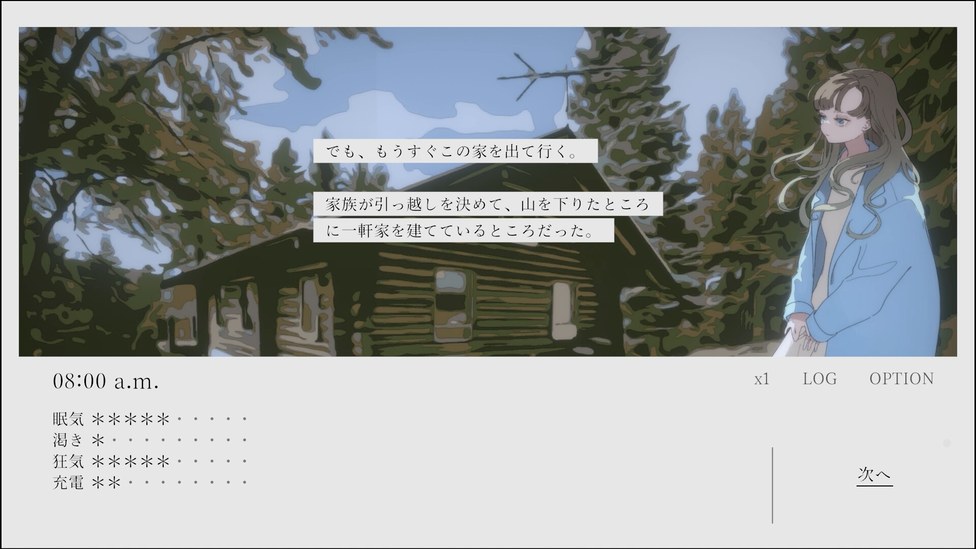 選択肢によって「眠気」「渇き」「狂気」「充電」の四つが増減します。