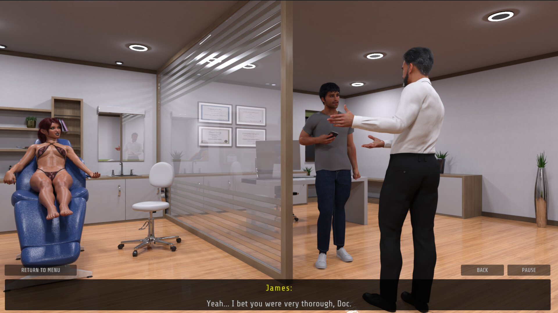 An erotic VISUAL NOVEL featuring HD graphics, steamy ANIMATIONS, and realistic-looking characters. A physical checkup spirals into a steamy affair when Lily reveals the secrets of her open marriage to the charming and insatiable Doctor Martin. Will James catch them in the act?