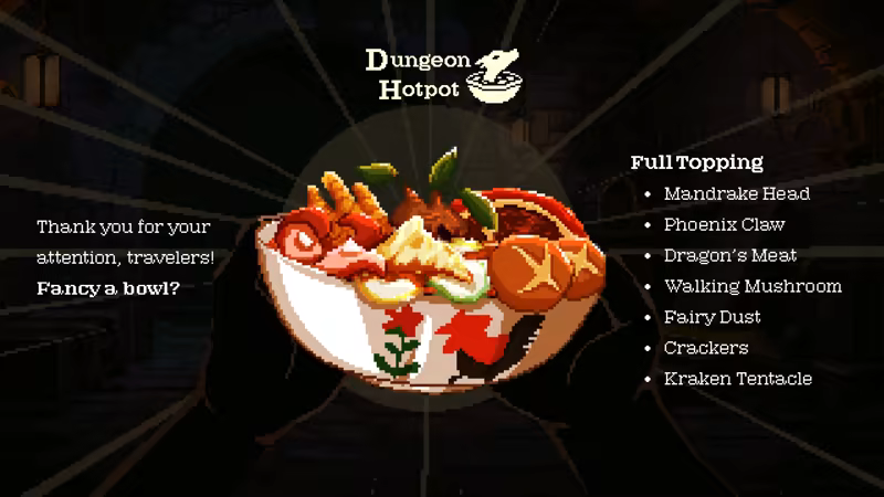 A narrative-tycoon game where you run a hotpot stall inside a dungeon! Craft monster-based dishes, manage store, and uncover epic tales! All while serving up the spiciest hotpot in the realm!